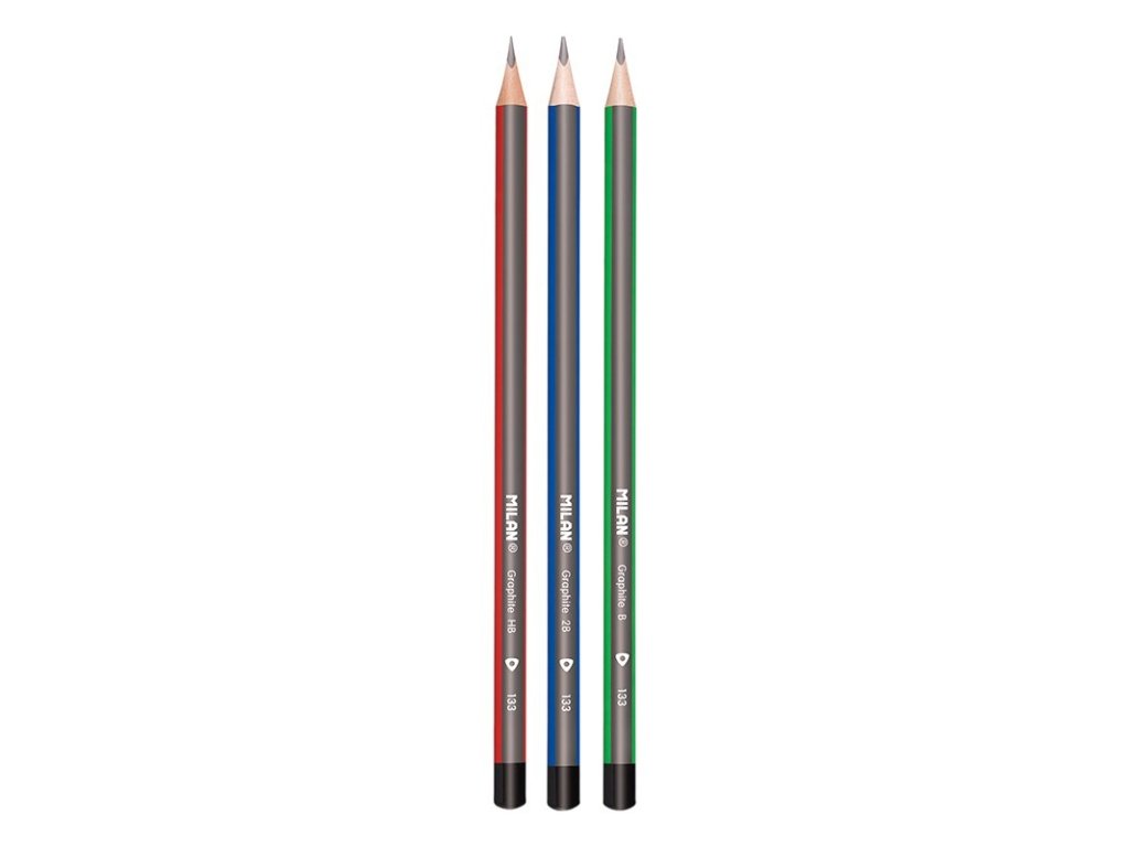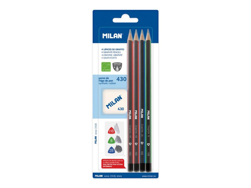 Sada 4 trojhranných grafitových tužek MILAN tvrdosti: 2x HB, 1x B, 1x 2B určených pro psaní a kreslení. V balení se nachází i měkká syntetická guma č. 430, vhodná pro odstranění grafitových stop ze všech druhů povrchů.Doplňkové parametry