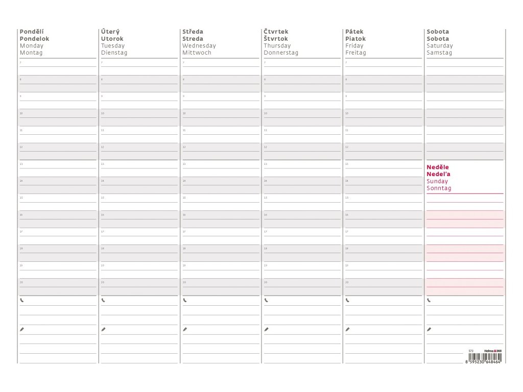Formát: 45 x 31,5 cm. Rozsah: 50 listov. Možnosť dokúpenia lišty S75 – lišta nie je súčasťou výrobku. Kalendár má lepenú väzbu v hornej časti.Doplňkové parametry