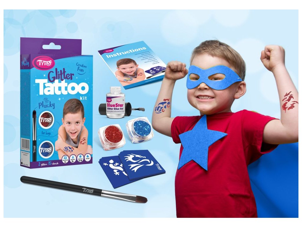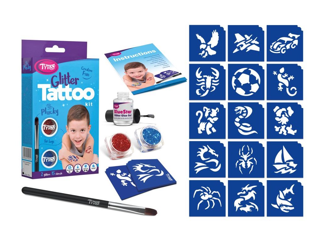 Nejpopulárnější klučičí vzory. Vzory: 15 ks. Barva: 2 ks. Vzor obvykle vydrží na kůži 8 – 18 dní. Délka této doby do velké míry závisí na typu kůže a míře opatrnosti, s jakou k tetování přistupujete. Třpytivé tetování je odolné vůči vodě, dá se však lehce odstranit alkoholem nebo dětským olejíčkem. Větší sady obsahují více nástrojů: Pohyblivé oči/samolepící kamínky: Hotový vzor můžete přizdobit. Naneste malé množství lepidla na samolepící kamínky a přitlačte jej na kůži. Přejeme vám hodně zábavy!Doplňkové parametry