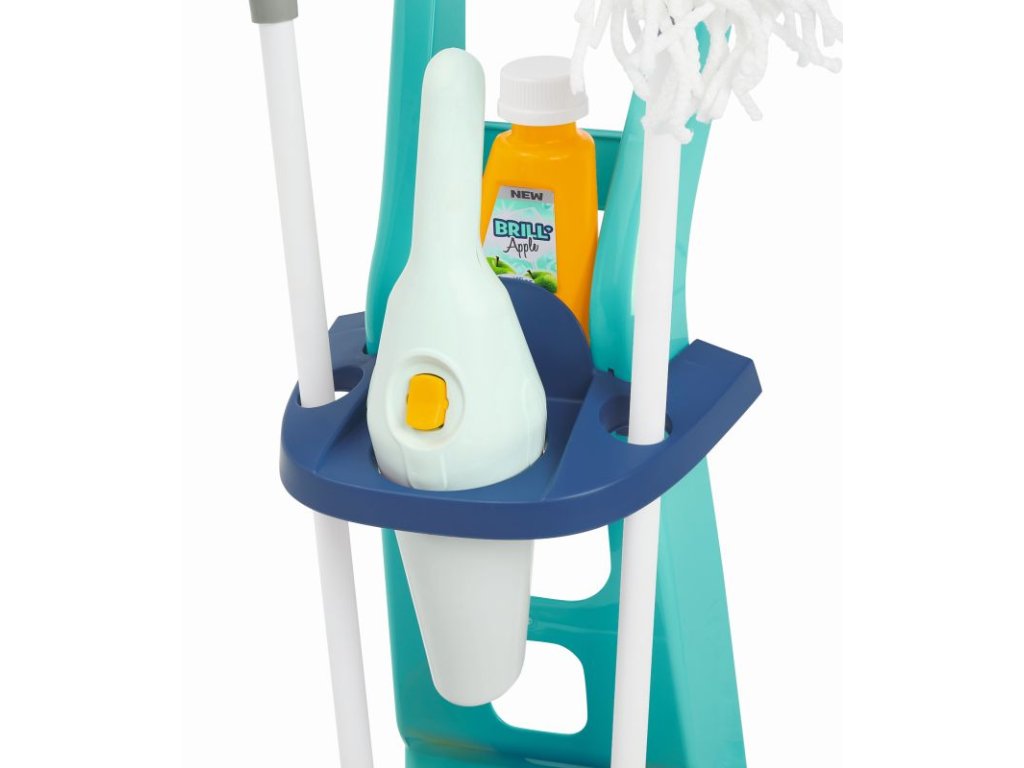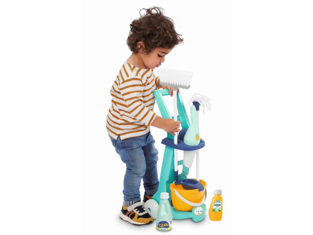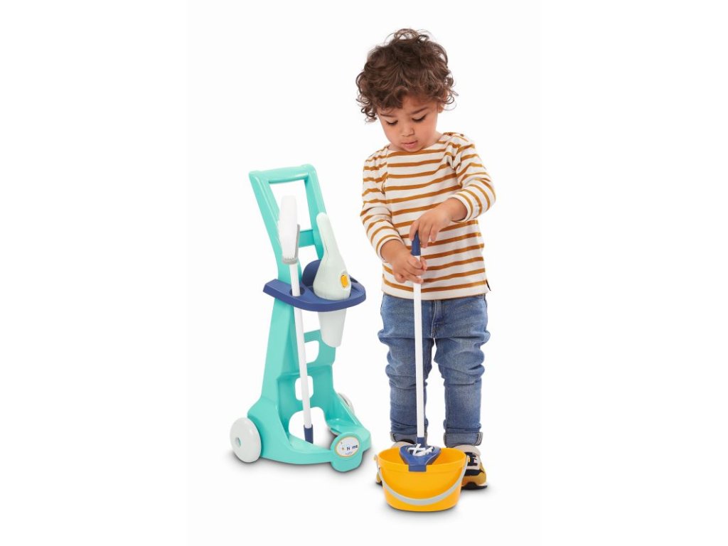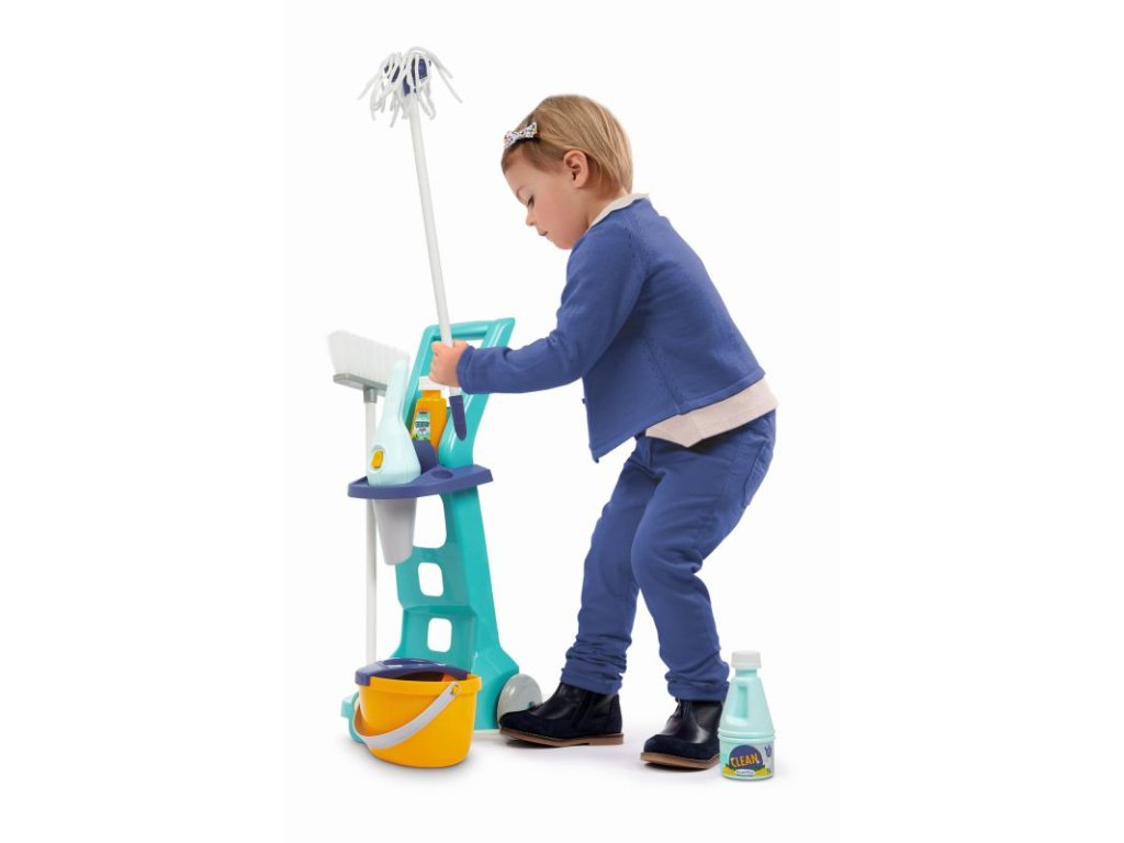 Vozík obsahuje veškeré potřebné náčiní: kbelík na úklid, mop, smeták, úklidové potřeby a ruční vysavač. Vozík pro domácnost je obzvláště lehký a ovladatelný, a proto jej lze vzít kamkoli. Tento úklidový vozík bohatý na detaily a bez ostrých hran je vhodný již pro děti od 3 let. Rozměry produktu (DxŠxV): 21 x 26,5 x 56 cm.Doplňkové parametry