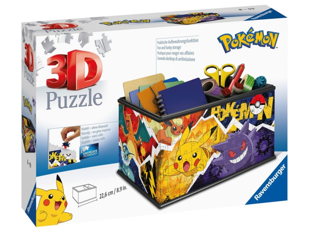 Prostě úžasné! 216 plastových dílků puzzle slouží k vytvoření pevné úložné krabice s motivem Pokémonů, která je kouzelným doplňkem pokoje každého dítěte. Úložná krabice je velmi praktická, s volně nastavitelnou přihrádkou. Použitelná pro uschování všech dětských pokladů.Doplňkové parametry
