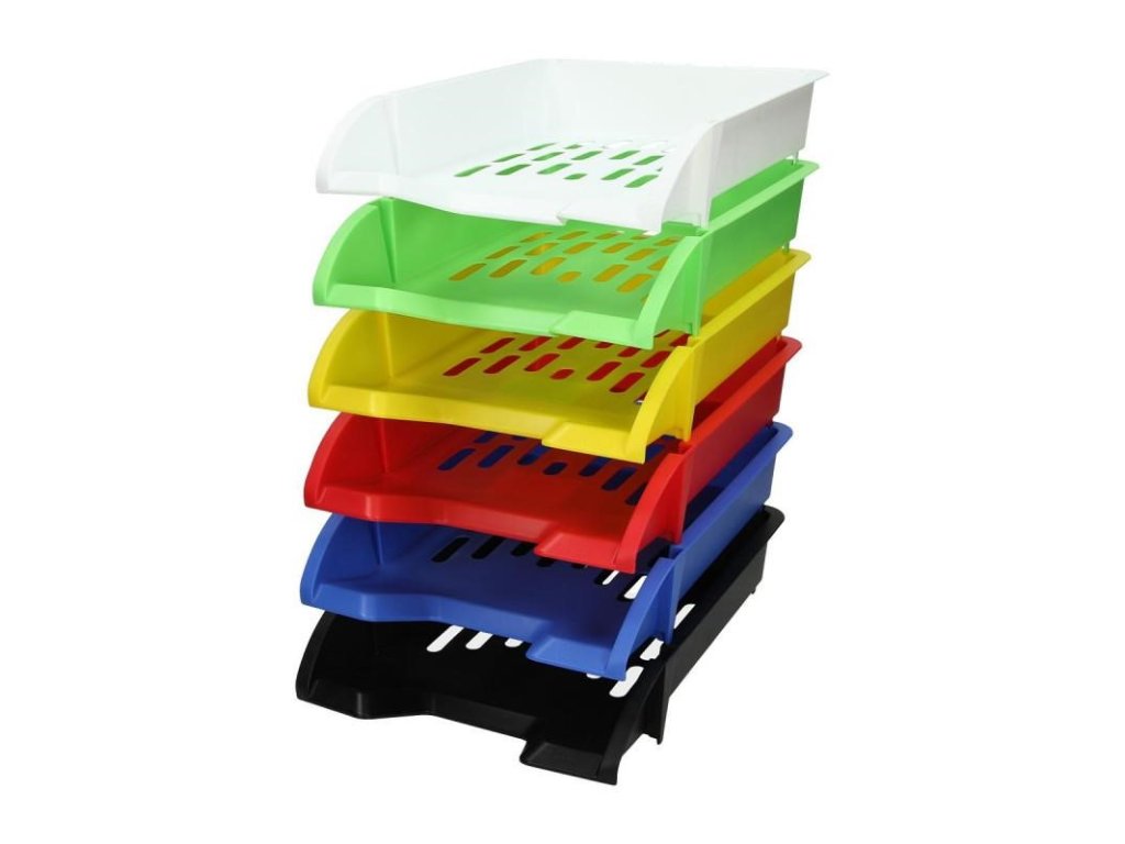 Stohovatelný plastový odkladač dokumentů formátu A4.