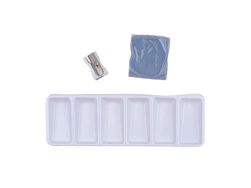 Obsahuje vše potřebné pro malování a skicování – barvy, štětce, tužku, gumu, struhadlo a paletu.