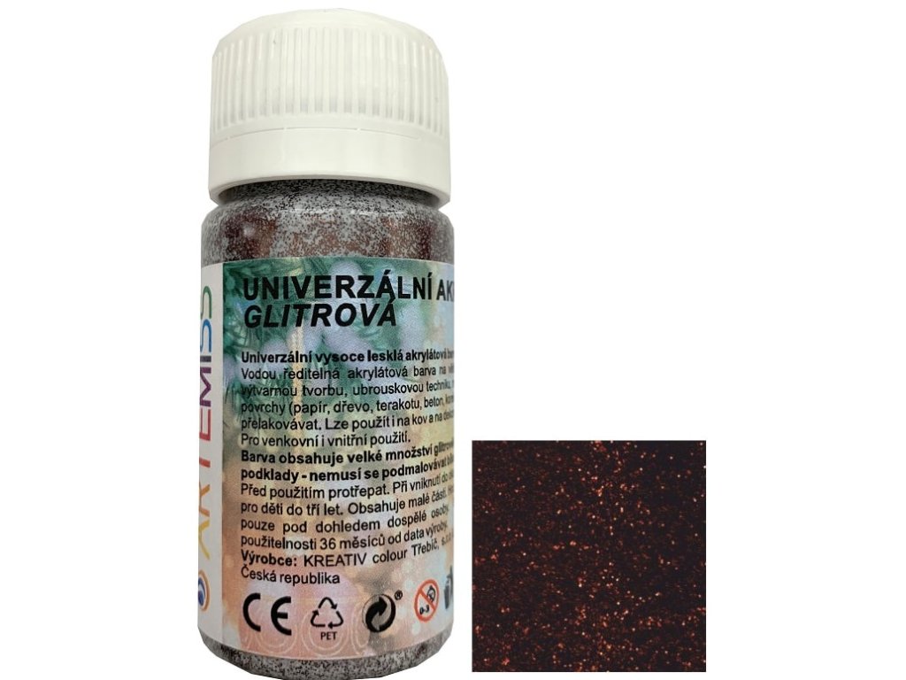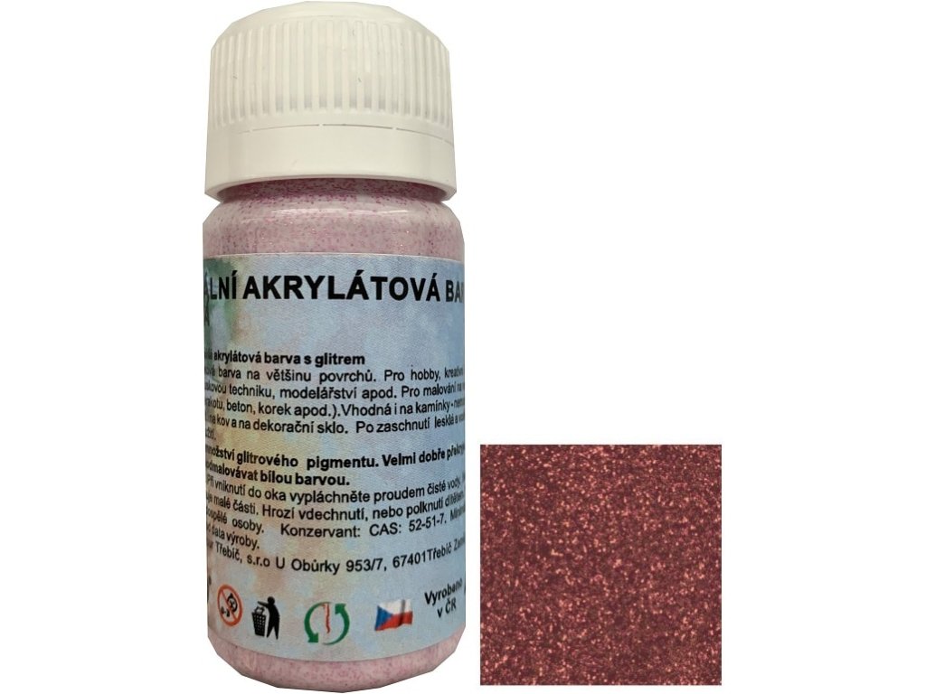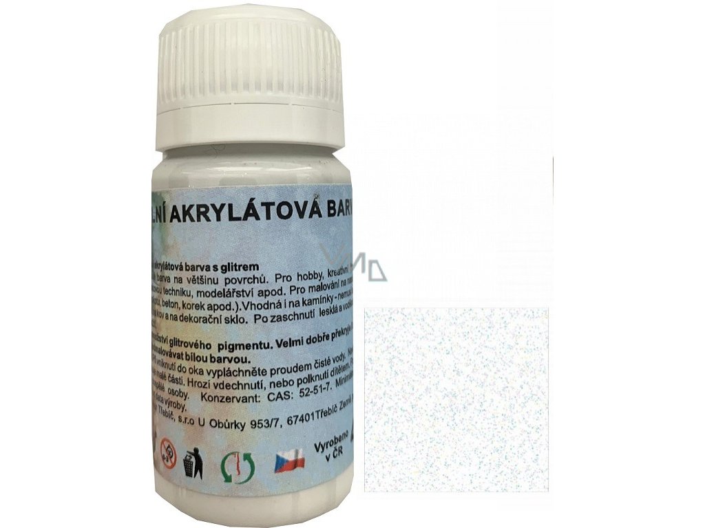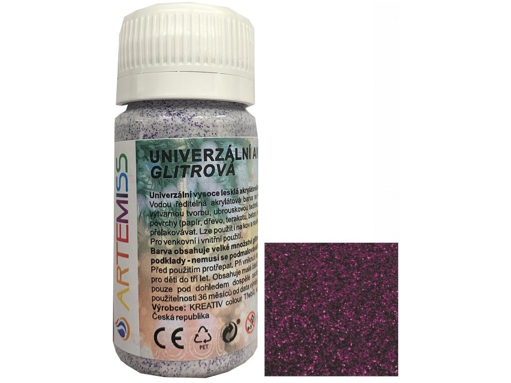 Je vodou ředitelná, to znamená, že pomůcky umyjete obyčejnou vodou a nepotřebujete žádná zvláštní ředidla. Barva je po zaschnutí voděodolná a je možné natřenou plochu čistit vlhkým hadříkem. Pro malování na nasákavé povrchy jako je papír, dřevo, terakota, beton, korek... Lze použít i na dekorační sklo a drobné kovové předměty Pro venkovní i vnitřní použití Použití Barvu v lahvičce dobře protřepejte nebo promíchejte. Naneste na čistý povrch a nechte zaschnout. Můžete natírat štětcem nebo tupovat houbičkou. Pokud je potřeba aplikujte dvě vrstvy. Pracovní pomůcky umyjte vodou. Nenechávejte je úplně zaschnout. Skladování Skladujte v dobře uzavřených obalech, při pokojové teplotě. Zabraňte přímému slunečnímu svitu a vysokým teplotám. Nesmí zmrznout. Rozvrstvení barvy při delším skladování není na závadu. Na výběr více barev: Růžová, fialová, zelená, modrá, hnědá, bílá, stříbrná, červená Požadovanou barvu prosím uveďte do poznámky Cena za 1ksDoplňkové parametry