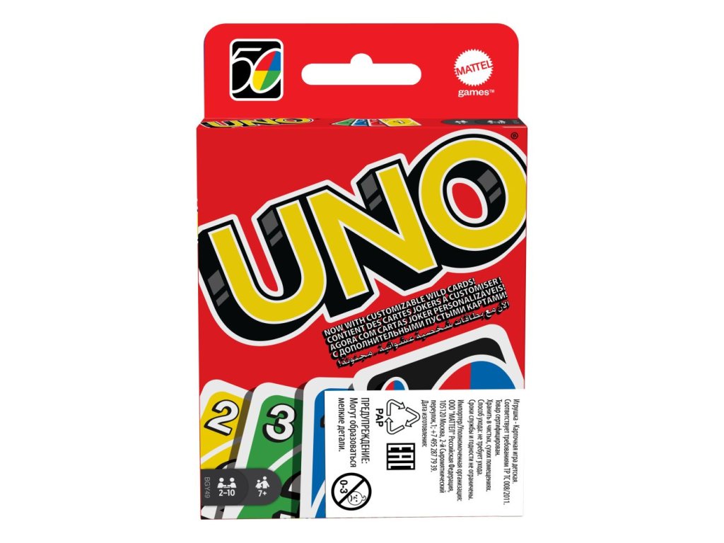 Hra UNO™ karty je klasická jednoduchá karetní hra s přiřazováním karet stejných barev a čísel, a která nyní přichází s novinkou – v balíčku najdeš 3 akční přepisovatelné divoké karty, díky kterým můžeš vytvářet svá vlastní pravidla! V balíčku najdeš celkem 19 karet od každé ze čtyř barev (červená, zelená, modrá a žlutá) a speciální karty: 8x Vezmi si dvě karty, 4x Změna směru (v každé barvě), 4x Přeskoč karty (v každé barvě) a společně s nimi také 4x Divoká karta, 4x Vezmi si 4 karty, 1x Vyměň si karty a 3x karty Přepiš to. Nezapomeň zakřičet „UNO“, když už máš v ruce jenom jednu kartu. Hra obsahuje 112 karet.Doplňkové parametry