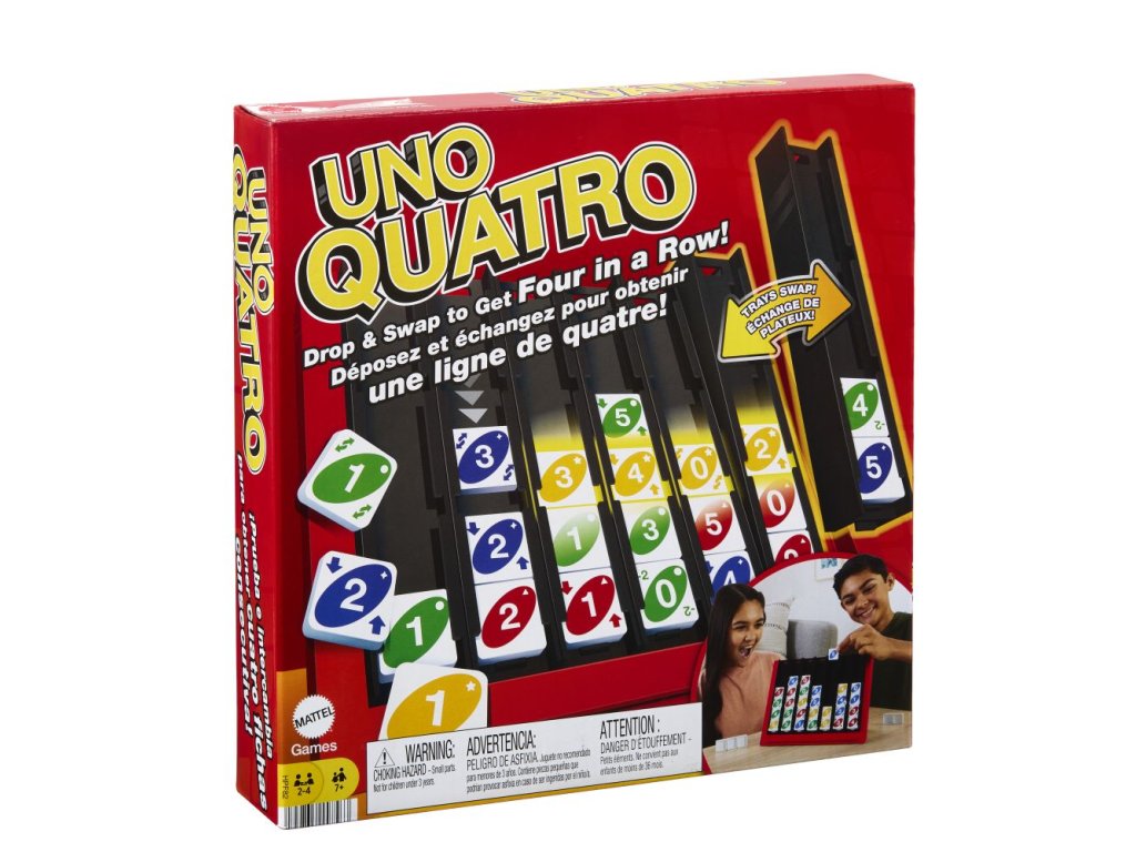 Karetní hra UNO™ Quatro vychází z karetní hry UNO®, kterou hráči znají a milují. UNO® Quatro kombinuje strategii přiřazování barev nebo čísel s výzvou získat čtyři v řadě a navíc speciální karty umožňují přesouvat karty a zásobníky, takže se situace může během jednoho tahu zcela změnit! Hra je ideální pro rodiny, večírky a herní večery, a je skvělým dárkem pro fanoušky UNO® a milovníky karetních her ve věku od 7 let. Barvy a provedení se mohou lišit.Doplňkové parametry