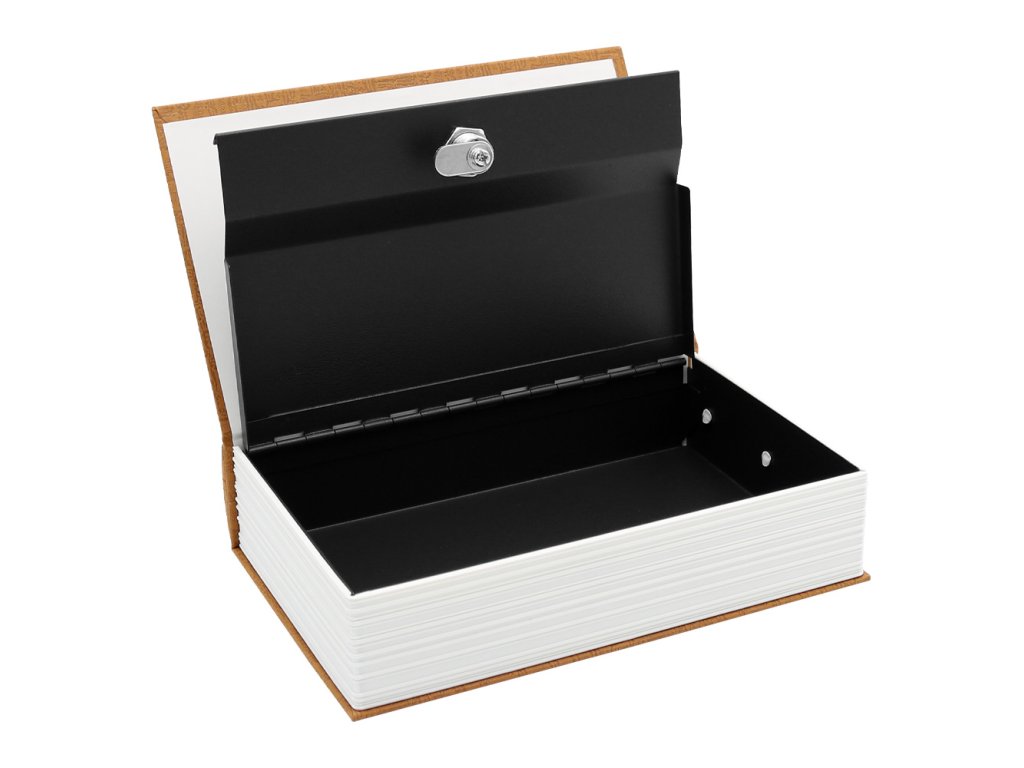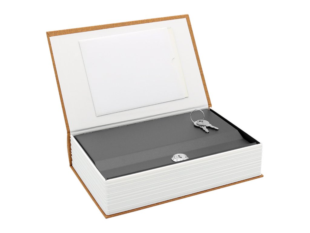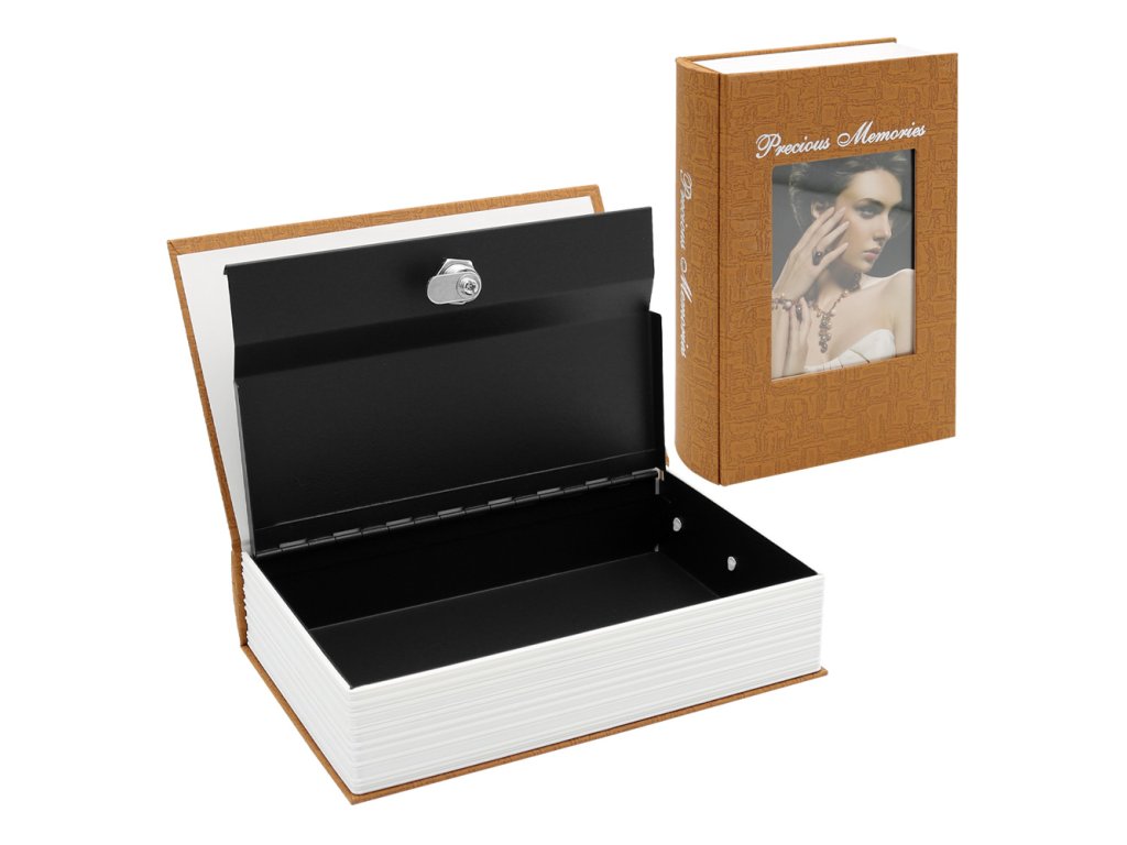 Uzamykatelný sejf zamaskovaný v knize s vyměnitelnou fotografií.