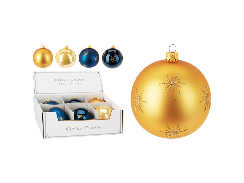 Vánoční koule matná zlatá / lesklá zlatá / matná modrá / lesklá modrá, dekorovaná třpytivým vzorem ve zlaté barvě.