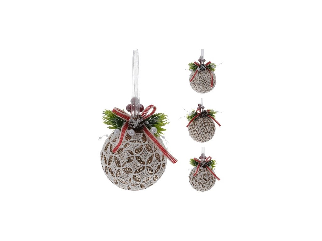 Vánoční koule 8 cm krajková se stuhou, zlaté třpytky, mix/1ks