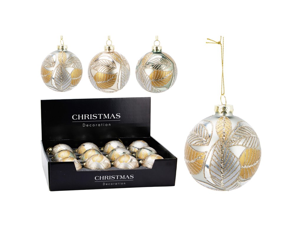 Vánoční koule 80 mm, dekor list glitrovaný (mix 3 barev, cena /1 ks)
