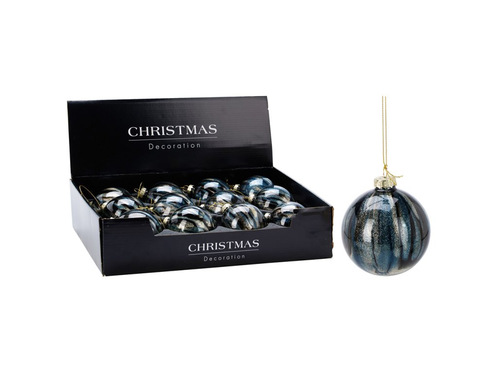 Vánoční koule s tříbarevným vzorem modrá, černá a zlatá barva.