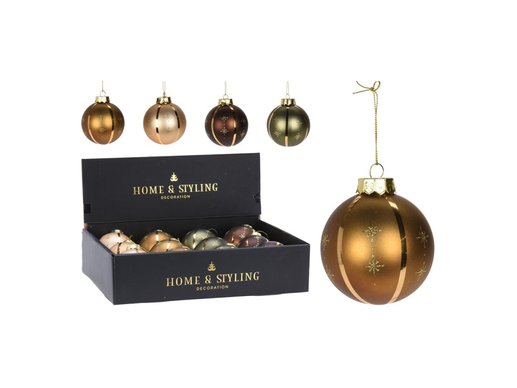 Nerozbitná vánoční koule/ozdoba matná s jemným zlatým a třpytivým dekorováním ve 4 barvách. Barvy: zlatá šampaň, bronzová, hnědá a zelená Materiál: polypropylenDoplňkové parametry