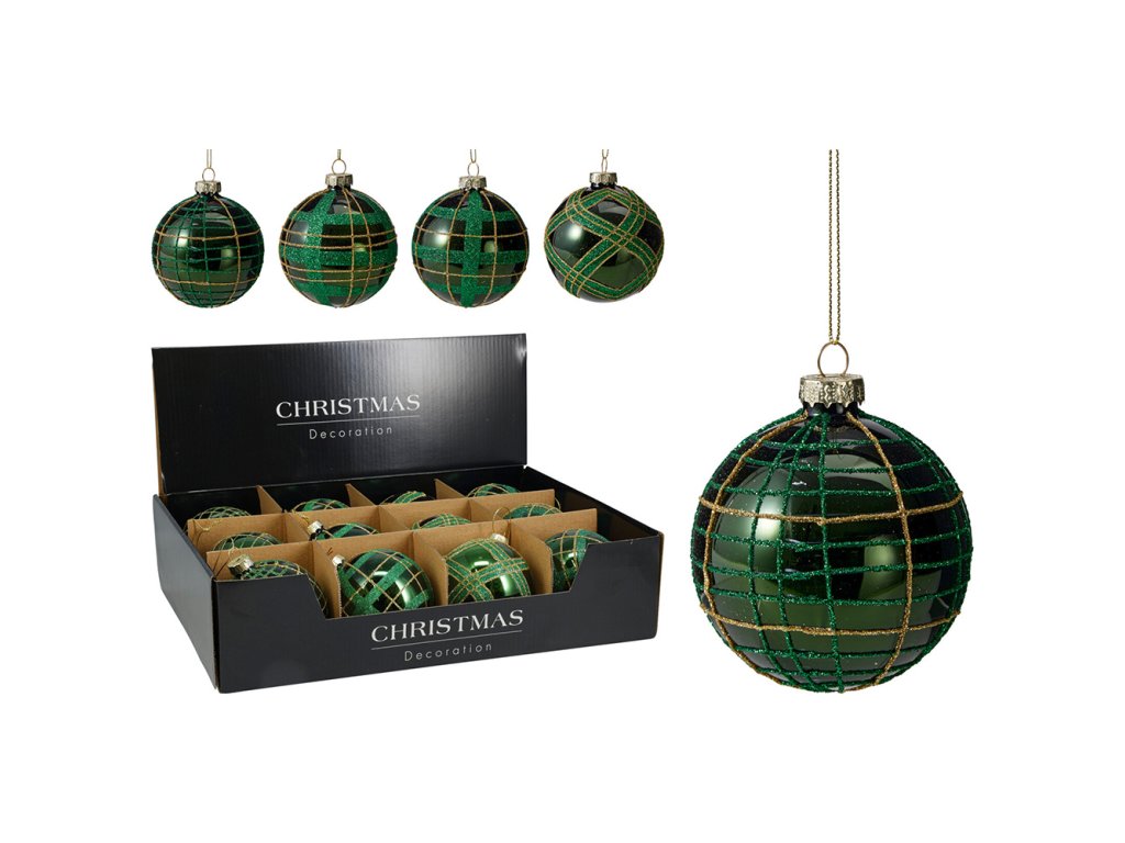 Vánoční koule 80 mm zelená kostkovaná, třpytivá (mix 4 barev, cena /1 ks)