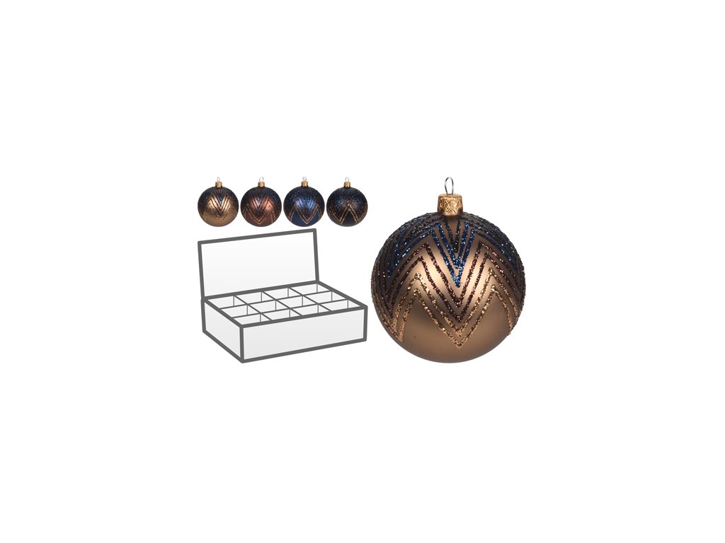 Skleněná koule s glitry - dekor vánoční koule je velmi elegantní a hodí se na každý vánoční stromeček. Průměr vánoční koule je 100 mm. Mix barvy: černá, tmavě modrá, hnědá, zlatá. Povrch má efekt matný s glitry.Doplňkové parametry