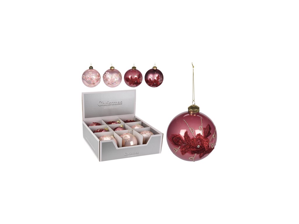 Skleněná koule zdobená jemnými výšivkami ve tvaru květin. Dekor vánoční koule je velmi elegantní a hodí se na každý vánoční stromeček. Průměr vánoční koule je 100 mm. Matný a lesklý povrch. Mix barev: růžová a bordó.Doplňkové parametry