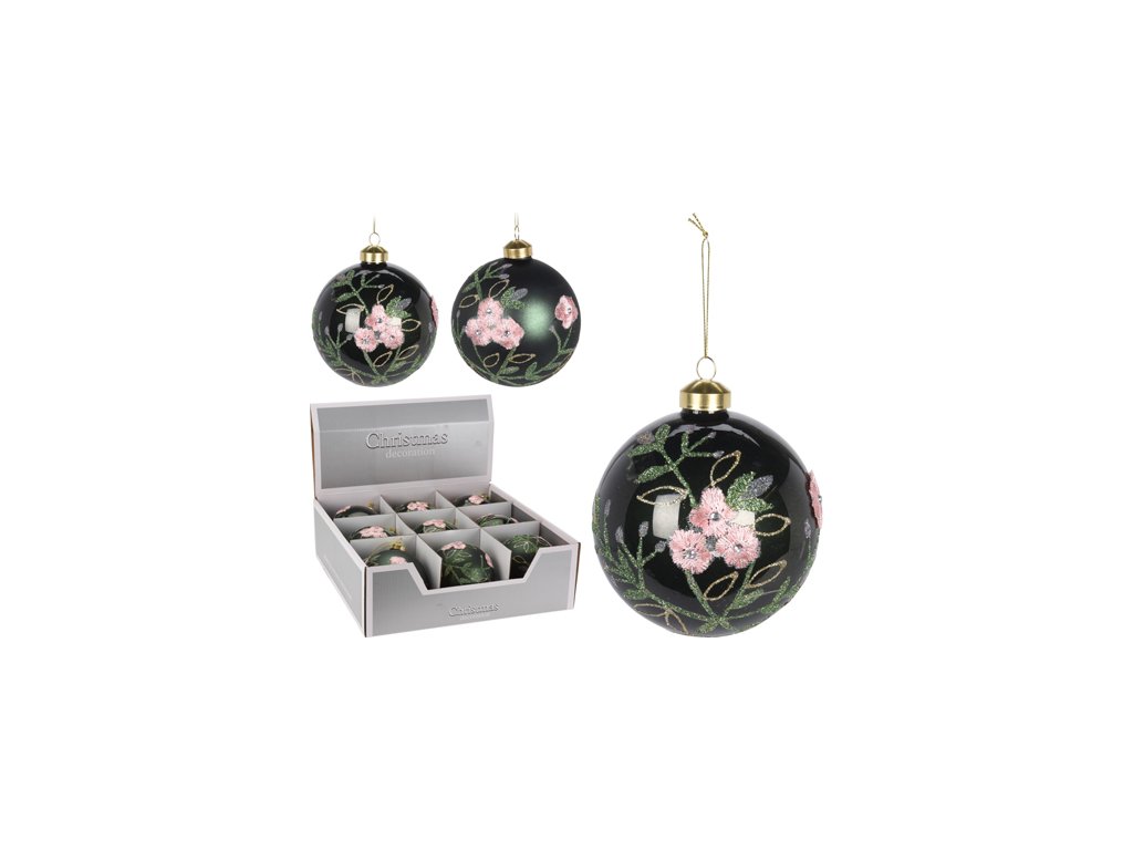 Skleněná koule zdobená jemnými výšivkami ve tvaru květin. Dekor vánoční koule je velmi elegantní a hodí se na každý vánoční stromeček. Průměr vánoční koule je 100 mm. Matný a lesklý povrch v tmavě zelené / smaragdové barvě.Doplňkové parametry