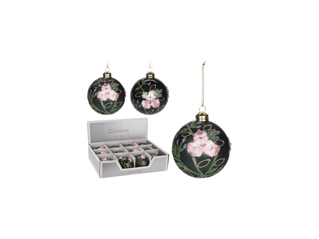 Skleněná koule zdobená jemnými výšivkami ve tvaru květin. Dekor vánoční koule je velmi elegantní a hodí se na každý vánoční stromeček. Průměr vánoční koule je 80 mm. Matný a lesklý povrch v tmavě zelené / smaragdové barvě.Doplňkové parametry