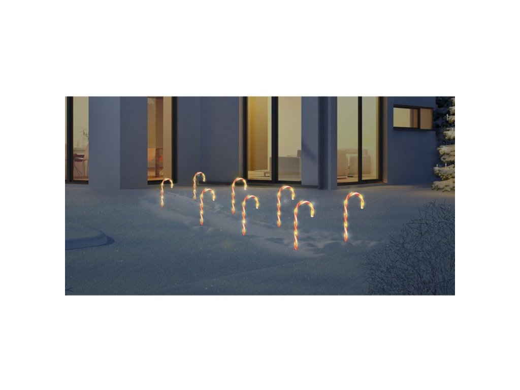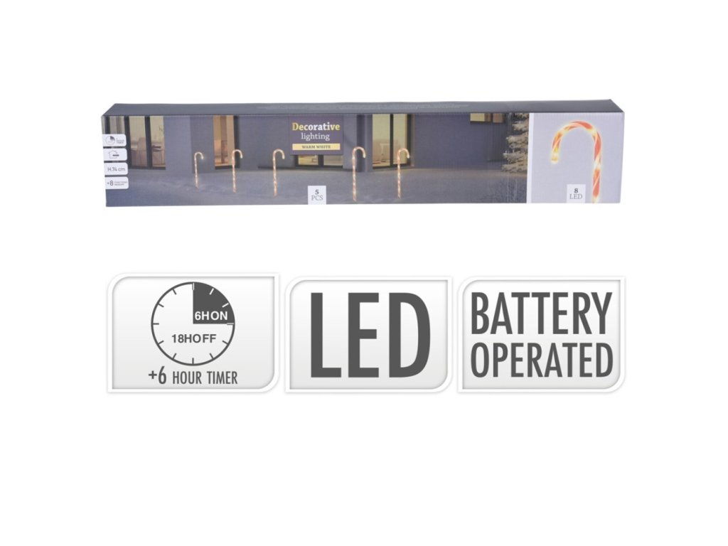 Sada vánočního osvětlení (5 ks) v podobě lízátka určené k zapíchnutí do země s časovačem. - obsahuje 8 LED teplá bílá / 1 lízátko - 1 m vzdálenost mezi lízátky Programátor s 8 funkcemi Časovač: svítí 6 hod. / nesvítí 18 hod. Baterie: 3x AA 1,5V (nejsou součástí balení) Pro venkovní použití, ochrana IP44.Doplňkové parametry