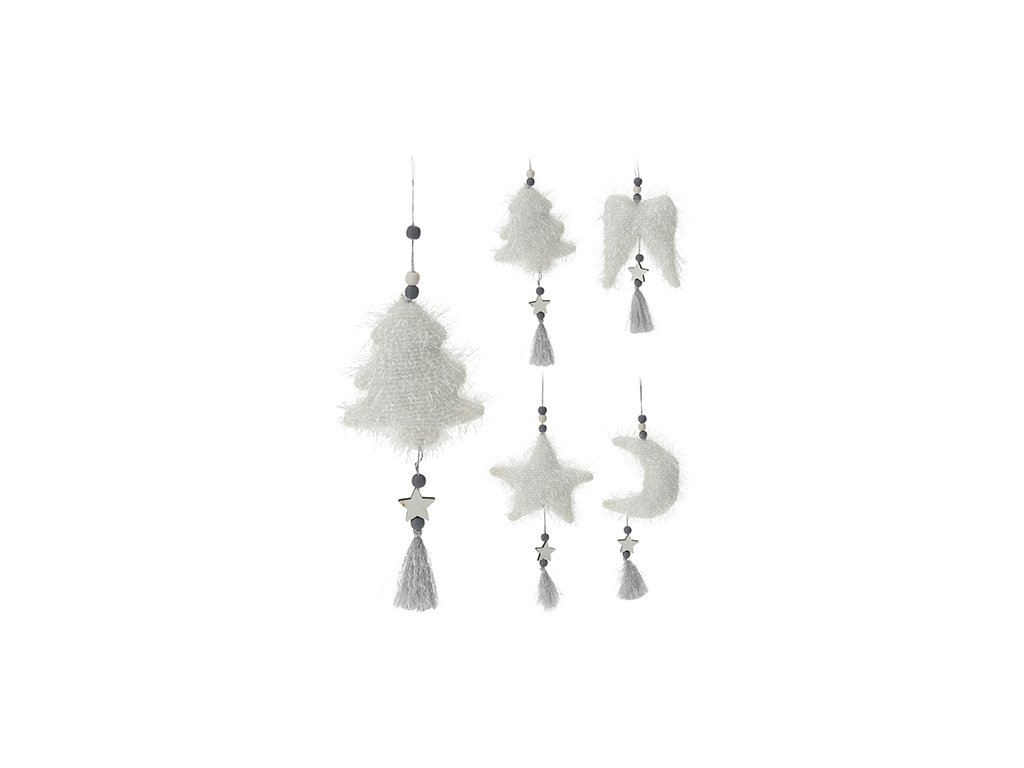 Látková dekorace - stromeček, křídla anděla, hvězda, měsíc v bílé barvě s třásní, hvězdou a dřevěnými korálky.- stříbrná šňůrka na zavěšení s korálky