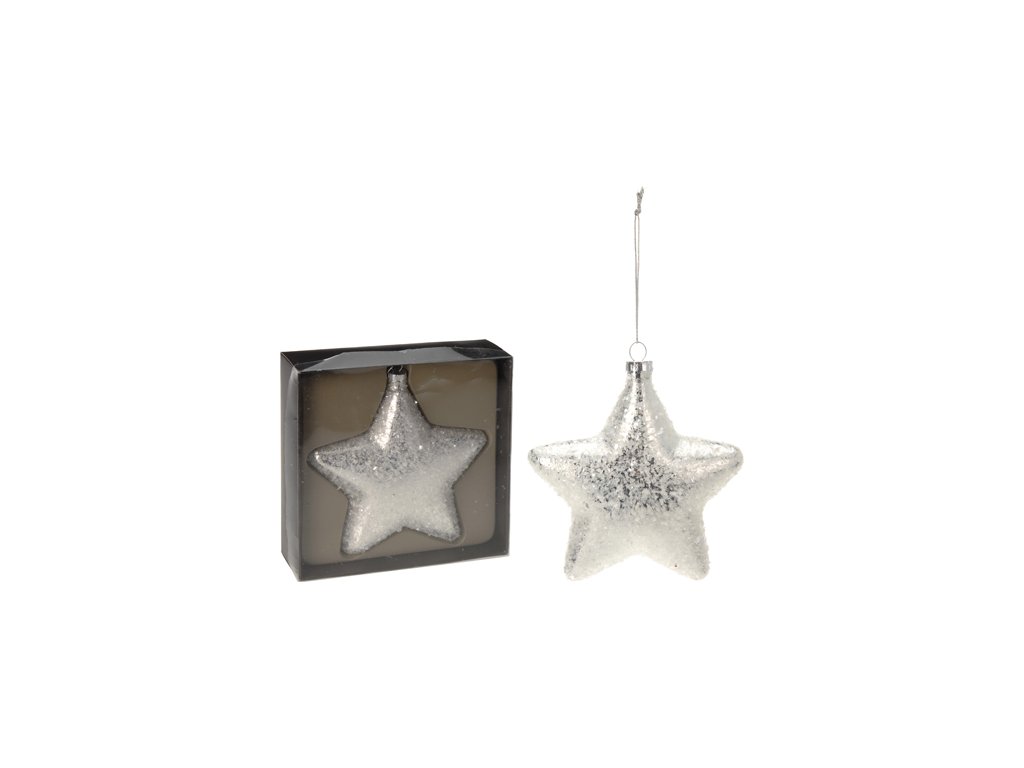 Vánoční dekorace, závěsná ve tvaru hvězdy. Stříbrná, s plastovými třpytkami, které vytvářejí dojem umělého sněhu. Vyhotovené ze skla. Rozměr ozdoby 15cm. Luxusní dekorace na Váš vánoční stromeček.Doplňkové parametry