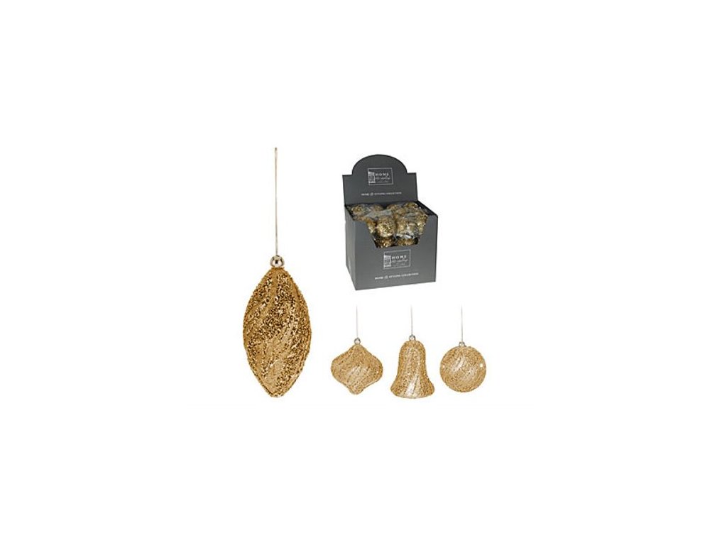 Závěsné vánočně ozdoby ve 4 různých tvarech. Průměr: 8 cm. Balení obsahuje 2 ks. Výběr tvaru prosíme uvést do poznámky při objednávce zboží. Barva: zlatá s flitry.Doplňkové parametry