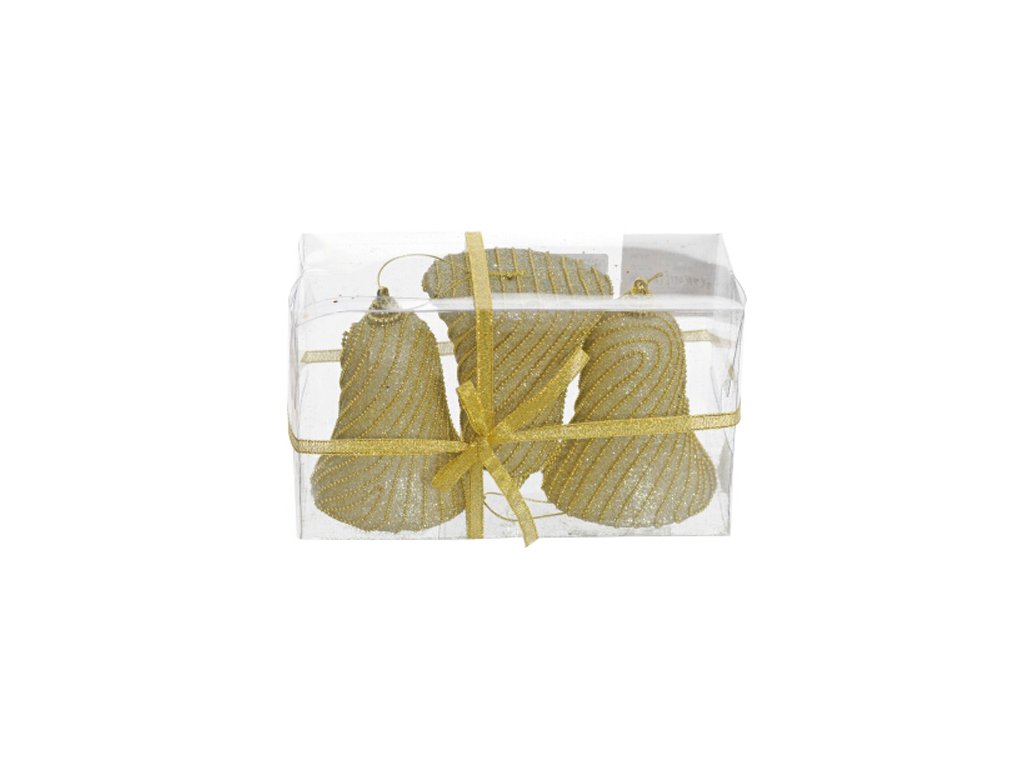 Vánoční závěsná ozdoba ve tvaru zvonku, ve zlaté barvě zdobená korálky. Sada obsahuje tři kusy. Rozměr jedné ozdoby 10x7cm.Doplňkové parametry