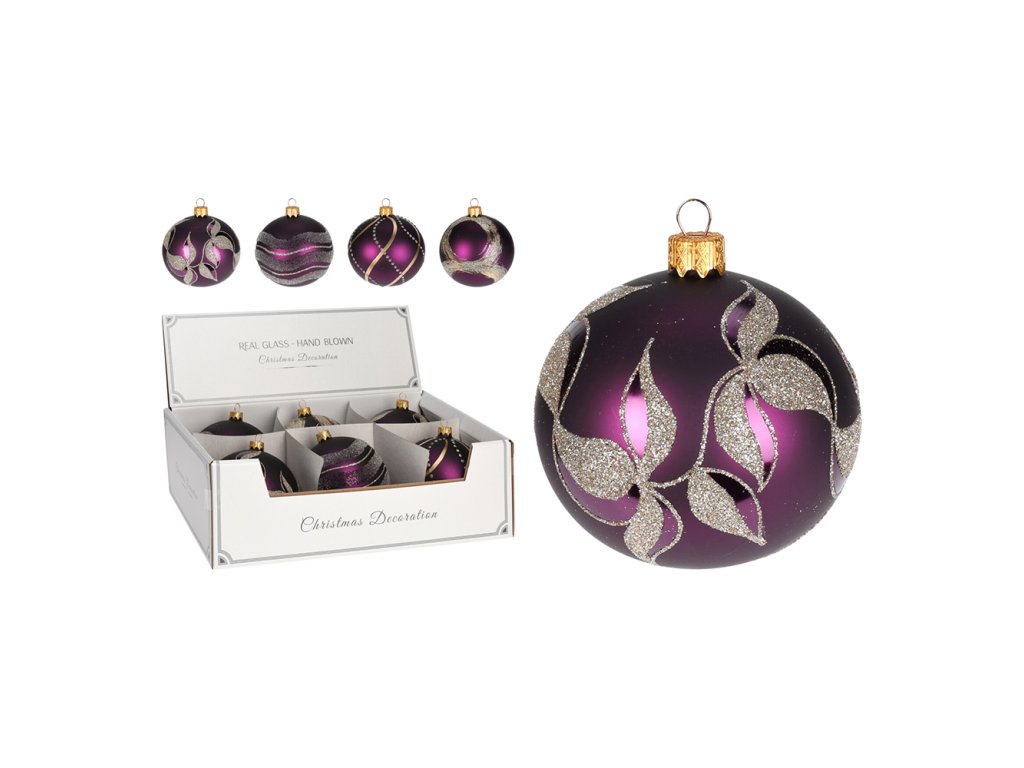 Vánoční koule ručně foukaná, fialová matná s perleťovým dekorováním a třpytkami ve 4 designech. Cena je za 1 kus. Hmotnost: Materiál: skloDoplňkové parametry