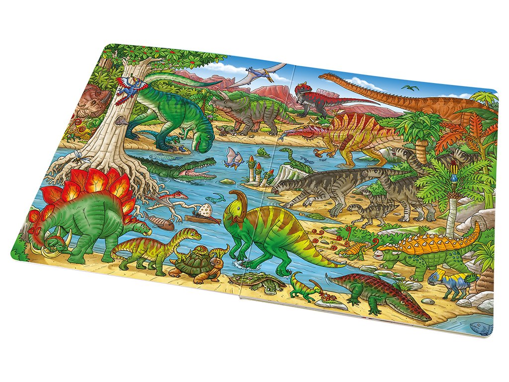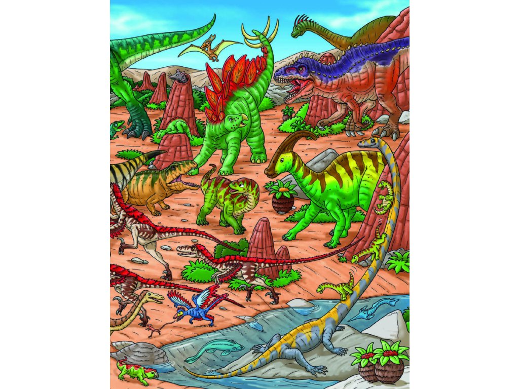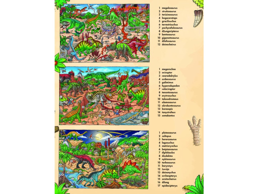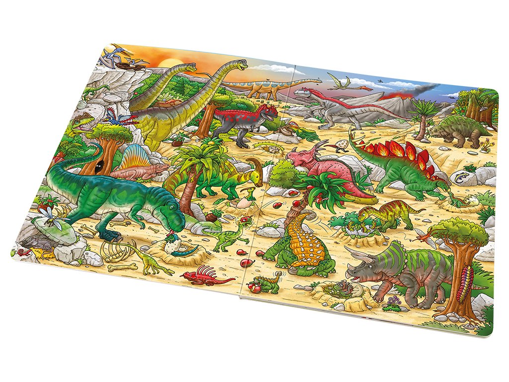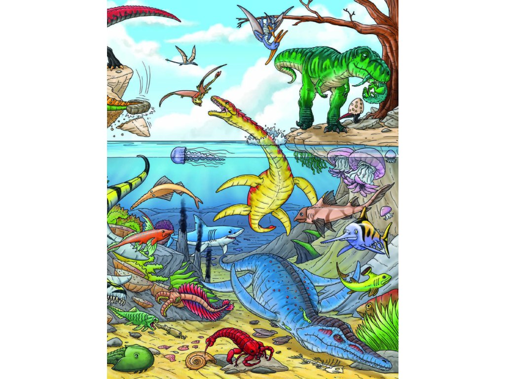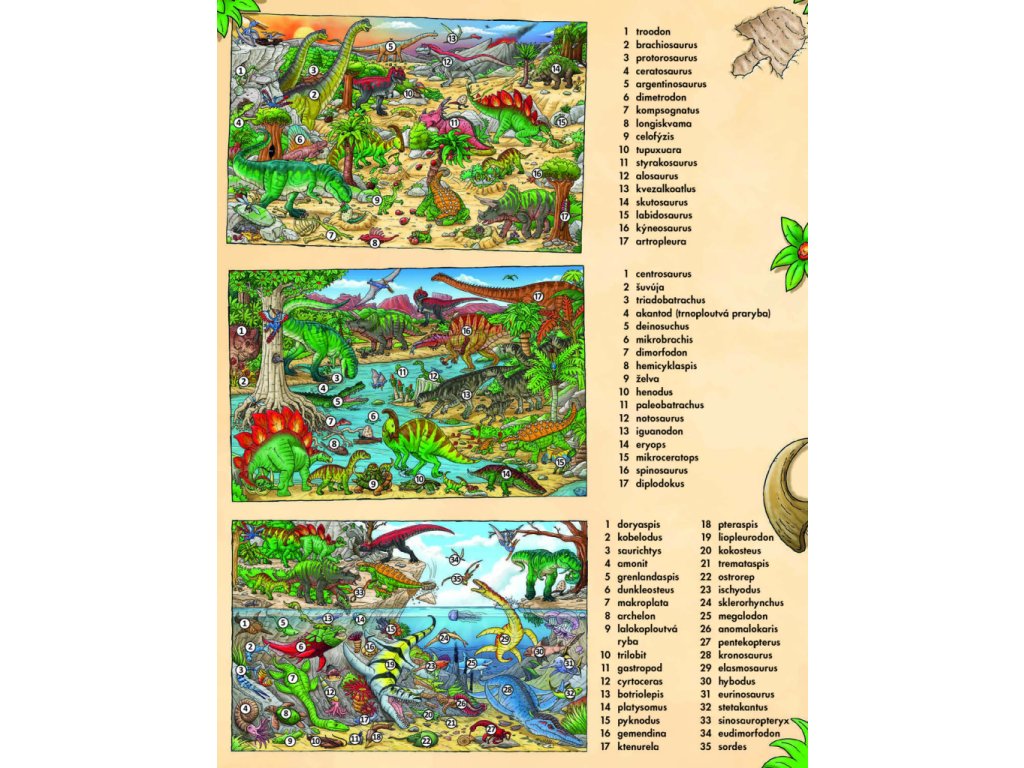 V pravěku to na zemi vypadalo úplně jinak než dnes. A hlavně tu nežili lidé! Svět byl královstvím veleještěrů zvaných dinosauři, kteří obývali všechna myslitelná prostředí. Někteří žili na souši, jiní pod vodní hladinou a teritoriem dalších byl zase vzdušný prostor. Jednotlivé druhy se proto od sebe hodně lišily. Tahle knížka vám představí pravěký svět dinosaurů v celé jeho kráse a rozmanitosti. Poznáte druhy, které létaly, plavaly, lezly, běhaly… Když se budete dobře dívat, odhalíte dokonce to, jak se jedni dinosauři bránili útokům druhých, čím se živili nebo jak přicházela na svět jejich mláďata. Někteří z ještěrů jsou vyobrazeni na každé stránce – vyzkoušejte svůj postřeh a hledejte je znovu a znovu na krásných barevných obrázcích plných roztodivných pravěkých tvorů! Na konci knihy pak najdete kompletní seznam názvů vyobrazených dinosaurů – naučte se je znát a staňte se odborníky přes tyto oblíbené pratvory!Doplňkové parametry