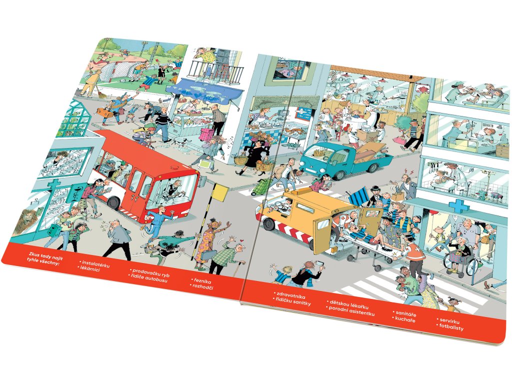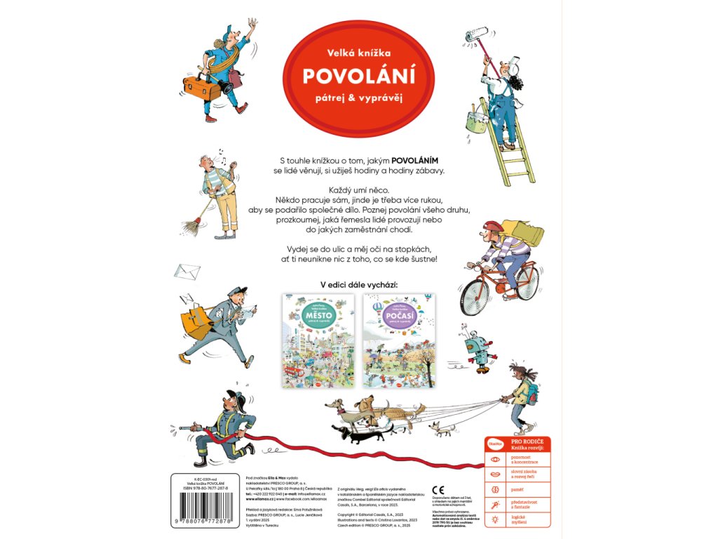 S touhle knížkou o tom, jakým POVOLÁNÍM a činnostem se lidé věnují, si užijete dlouhé hodiny zábavy! Poznáte, jaká řemesla lidé provozují nebo kam chodí do zaměstnání. Najdete tu spoustu příběhů s dobrým koncem, ale i řadu neslavných příhod. Mějte oči na stopkách! Každá stránka je plná detailních barevných obrázků, v nichž lze donekonečna objevovat vždy nové a nové věci, vtípky, postavy i jejich dobrodružství. Řada z nich je úplně obyčejných, ale mnohé jsou tak neobvyklé, že je lze spatřit nebo prožít právě jen na stránkách tohohle krásného velkoformátového leporela.Doplňkové parametry