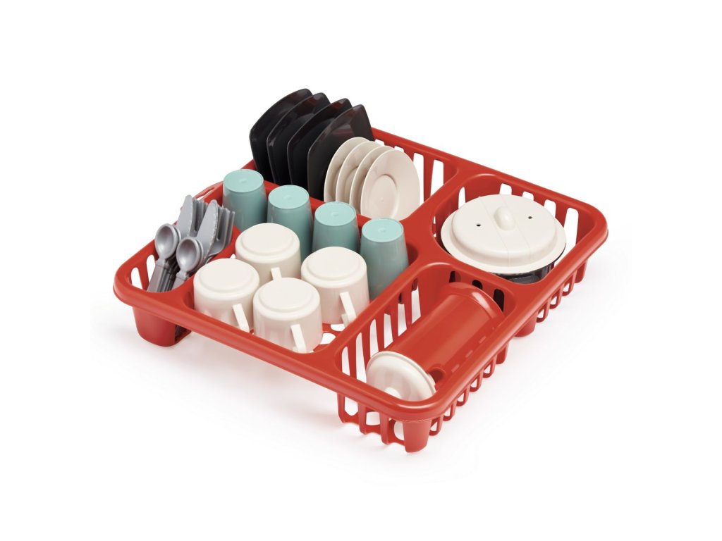 Velká sada nádobí s odkapávačem obsahuje hrníčky, příbory, talíře, hrnec s poklicí, konvičku s poklicí a šálky s podšálky. Rozměry odkapávače 29,5 x 10 x 29 cm. Věk: 18M+Doplňkové parametry