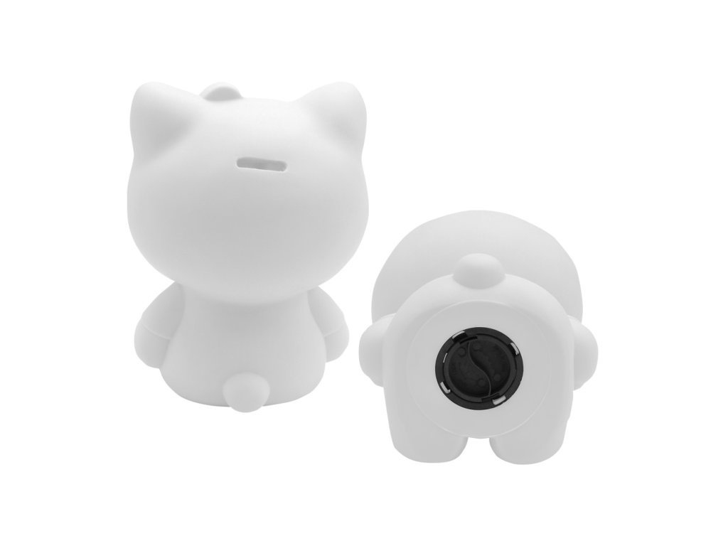 Pokladnička má otvor na mince v zadní části hlavy a otočné víčko pro vybírání mincí na podstavě.