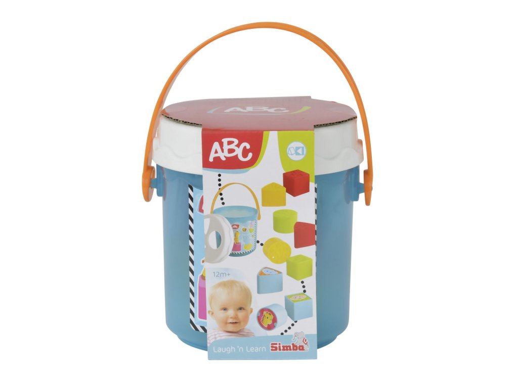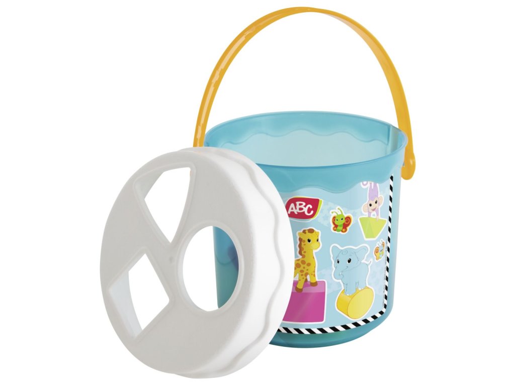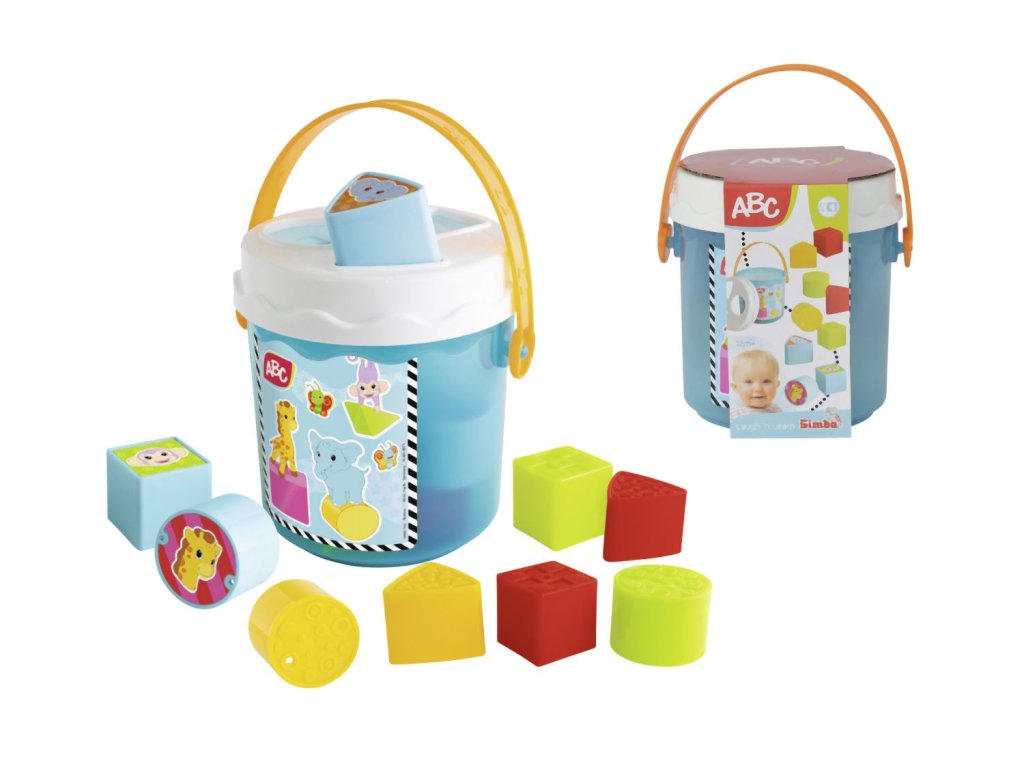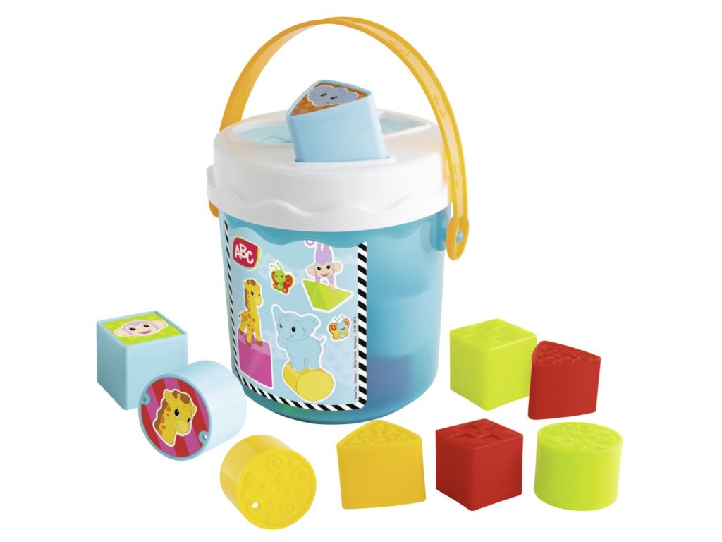 Barevné kostky v kyblíku s víkem se třemi různými otvory pro vkládání dle tvaru, 11 ks, velikost kyblíku 15 cm.Doplňkové parametry
