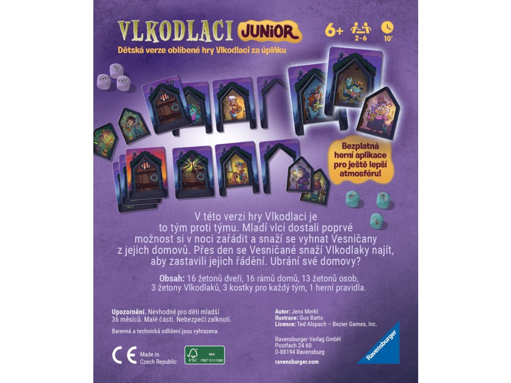 Nic pro malé strašpytly! Dokážete dobře klamat svoje protihráče? Nikdo si na vás nepřijde? Pak jste tu správně! Vklouzněte do jedné z rolí vesničané nebo vklodlaků a užijte si pořádné dobrodružství. Tato zábavná a napínavá společenská hra vás s rodiči nebo kamarády zabaví klidně na celé odpoledne. Nechce se nikdo z vás ujmout role moderátora? Nevadí. Součástí hry je aplikace, kterou si snadno a zdarma stáhnete do svého chytrého telefonu, a pomocí nahrávek za vás převezme roli moderátora a provede vás celou hrou.Doplňkové parametry