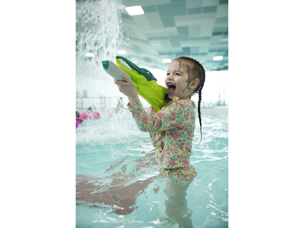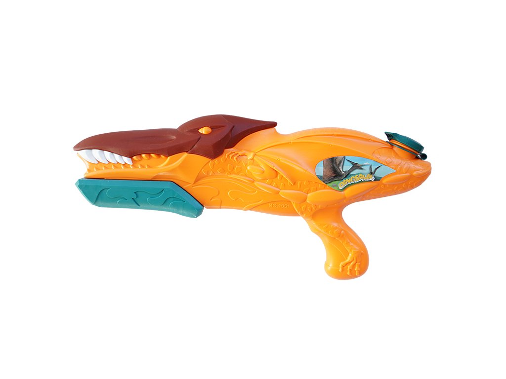 Vodní pistole ve tvaru dinosaura s nádobkou na vodu. Pistole je 40 cm velká.Doplňkové parametry
