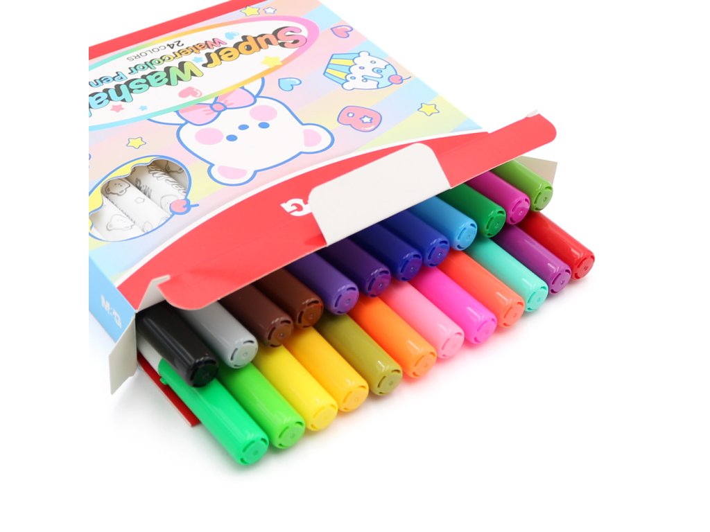 Sada 24 barev snadno omyvatelných fixů na vodní bázi.
