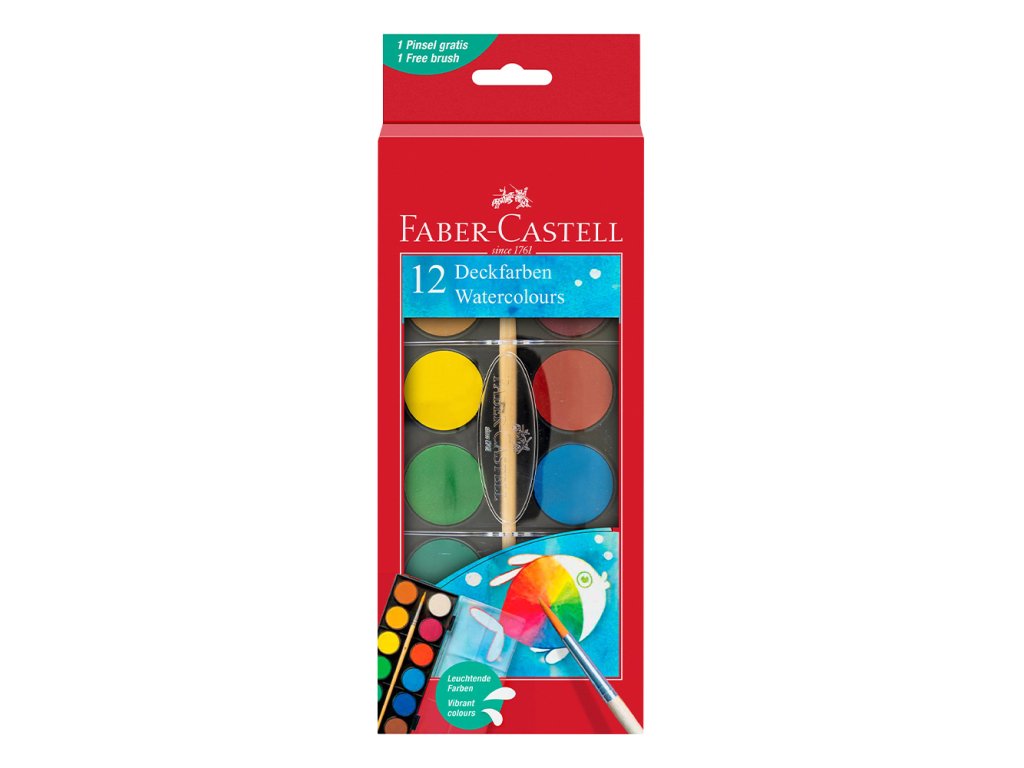 Vodové farby. Žiarivé a jasné farby s dobrou krycou schopnosťou.Neobmedzené možnosti miešania farieb. Dobré krycie výsledky na papieri a iných povrchoch. Pre zábavné maľovanie.Súčasťou balenia je štetec.Tablety s priemerom 30 mm. 12 farebné. Garancia:Faber-Castell garantuje spokojnosť zákazníkov od roku 1761. Ak nie ste úplne spokojný s výrobkom, pošlite ho prosím na bezplatnú výmenu. Upozornenie! : Nevhodné pre deti do troch rokov - obsahuje malé časti, hrozí nebezpečenstvo prehltnutia.Doplňkové parametry