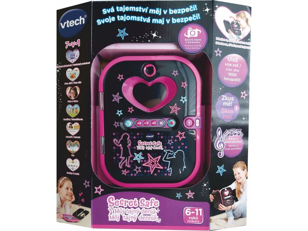 Zabezpečený deníček, fotoaparát, videokamera, make-up studio, virtuální mazlíčci, kreativní a vzdělávací hry, budík, hlasový záznamník, plánovač, animační studio, úprava fotografií.... a mnohem více! To vše najdeš v deníku Vtech Kidi Secret Safe - Můj tajný deník ®. Deník lze odemknout pouze vlastní tváří nebo tajným heslem. Vše v úplné české nebo slovenské lokalizaci!Doplňkové parametry