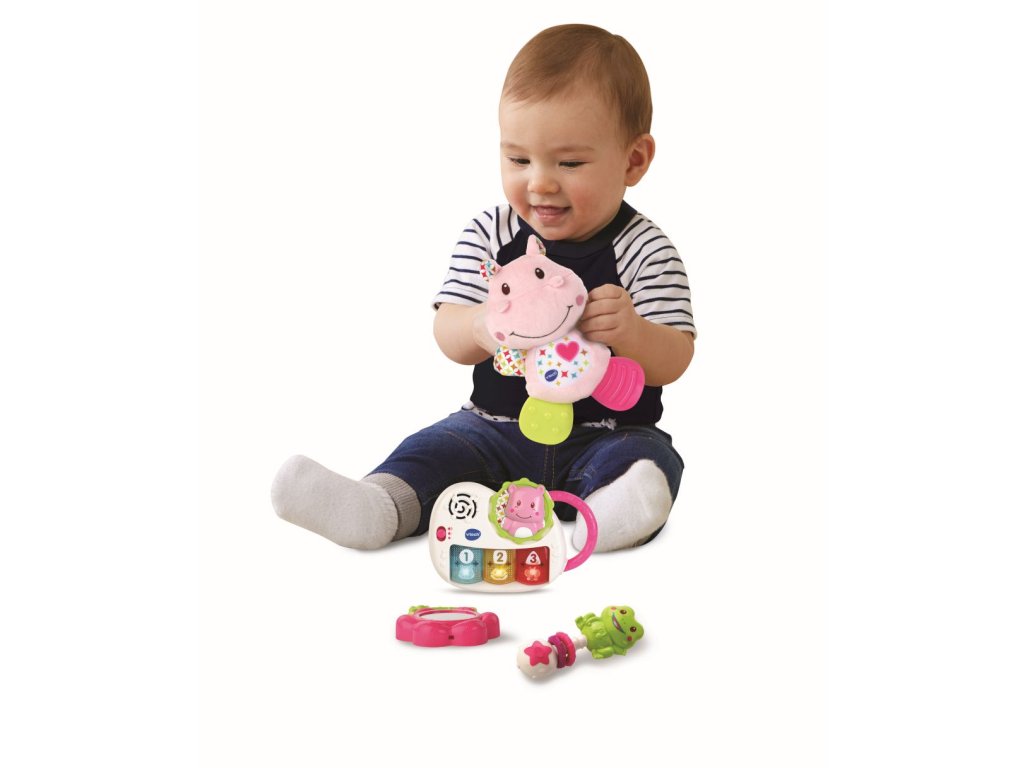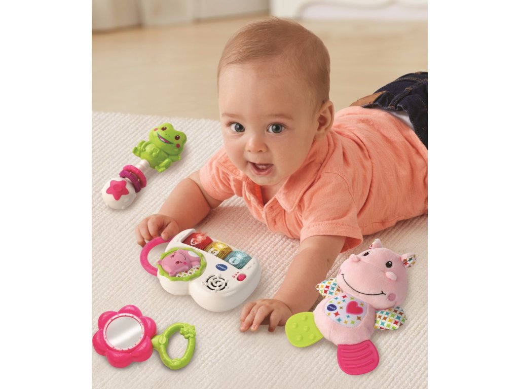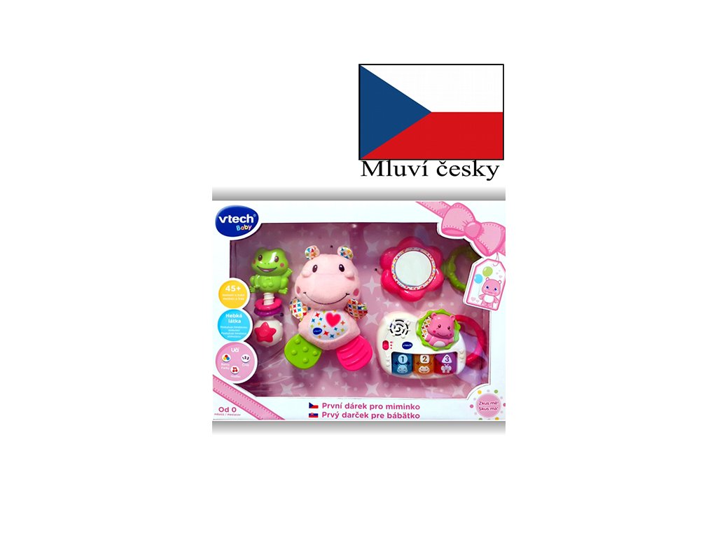 První dárek pro miminko od VTech® je jedinečný soubor hraček pro právě narozené miminko, které mu v prvních měsících jeho života budou přinášet spoustu radosti i poznání. Součástí je: Hrající a zpívající piáno, hebký hrošík, zrcátko, chrastítko žabička 1. Hrající a zpívající piáno. Mluví a zpívá česky. Stisknutím svítících kláves se dítě dozví něco o zvířatech, číslech, barvách, tvarech, uslyší zábavné písničky a melodie. Blikající klávesy stimulují zrakové vnímání. Rukověť piánka je přizpůsobena malým dětským ručičkám podporuje tak i rozvoj jemné motoriky dítěte. 2. Hebký hrošík. Sametově hebký hrošík s nožičkami pro žužlání a kousání. Svým tvarováním a texturami rozvíjí hmatovou stimulaci dítěte. Nohy hrošíka určené ke kousání, masírují i chladí dásně dítěte, a pomáhají nejen ke zklidnění dítěte, ale i od bolestí, které mohou první zoubky způsobovat. 3. Zrcátko. Se snadno uchopitelným držátkem rozvíjí sebepoznávání dítěte. 4. Chrastítko žabička. Třepáním chrastítkem rozvíjí dítě motorické dovednosti i zvukové vnímání. Písničky z piánka: Píseň 1 Klepni do piána, hudbu si hrej. Celý den od rána, hezky si zazpívej. Píseň 2 Já jsem hrošík kamarád, pěkné velké bříško mám. Vrť mě, toč mě, šimrej rád, to si pěkně užívám! Píseň 3 Žába hop, hop, hop Skáče do vody šplouch, žbluňk! Některé ze slov a frází: Já jsem šťastný a veselý hrošík. Pojďme si hrát! Mám dvě uši, úplně stejně jako ty! Žabička ráda skáče, a co ty? Motýlek se rád usmívá, úplně stejně jako ty! Červené, modré, žluté tlačítko Kolečko, čtverec, trojúhelník, Žabka, motýlek... Vhodné pro děti od 0 měsíců. 3 AAA baterie jsou součástí balení. Rozměr dárkového balení: 30 x 40 x 6,5 cmDoplňkové parametry