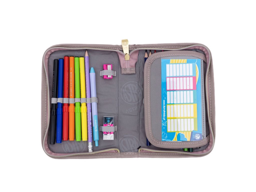 Vyklápěcí penál AstraBAG s kompletní výbavou kvalitních psacích potřeb. Ideální pro první stupeň ZŠ.Hledáte perfektní penál pro své dítě, který mu poskytne vše potřebné do školy? Vyklápěcí penál AstraBAG je přesně to, co potřebujete! Tento kvalitní penál s jednou klopou nabízí dostatek prostoru pro všechny psací potřeby, které váš školák potřebuje.