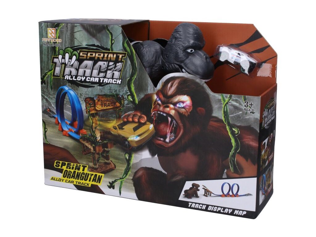 Vystřelovací dráha Orangutan 165 cm 1 auto. Rozměry dráhy. 165 x 20 x 13 cm. Dráha obsahuje 2 smyčky, vystřelovací plošinu, skokanský můstek, překážku orangutan s otevírací tlamou, autíčko 7,5 cm. Pro děti od 3 let.Doplňkové parametry