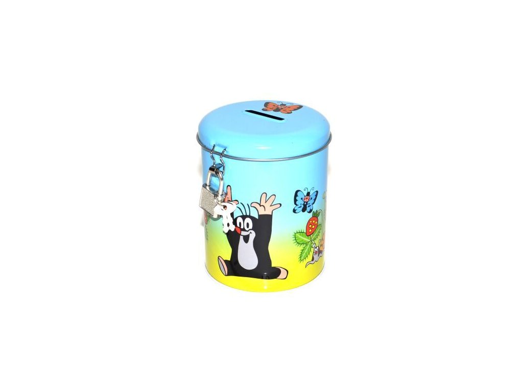 Kulatá plechová pokladnička se zámečkem.Doplňkové parametry