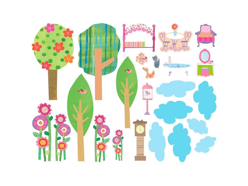 • rozměry cca 55cm x 41cm, dívky 12cm x 8cm, květiny stromy, nábytek a mraky jsou různé velikosti