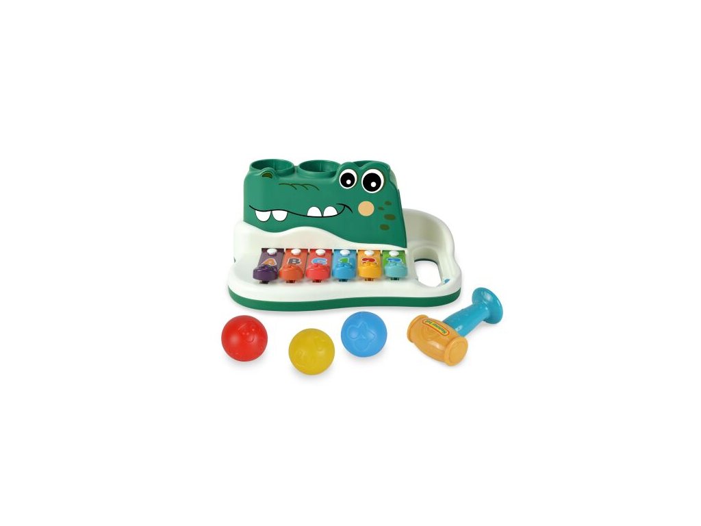 Xylofon zatloukačka krokodýl. Rozměry 25x16x12 cm. Kladívko a 3 míčky součástí. Doporučený věk: 18m+.Doplňkové parametry