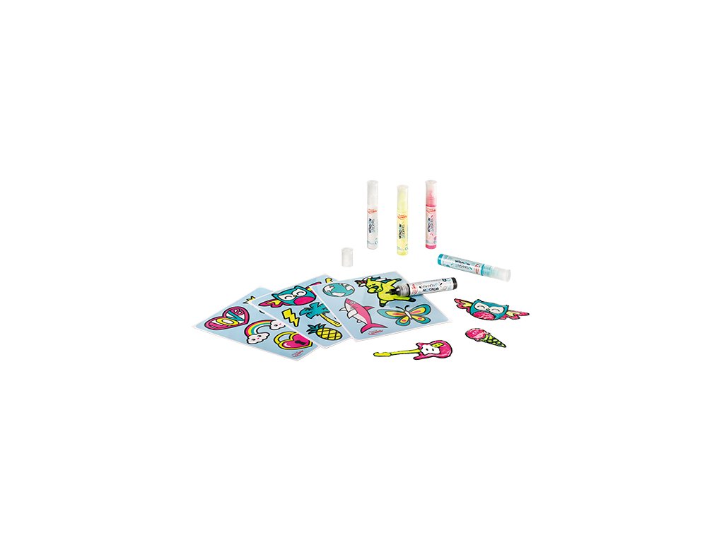 Sada pro vytvoření vlastních samolepek obsahuje: 30 obrázkových zalaminovaných šablon 5 tub s barvou (tyrkysová, fluo žlutá, růžová, bílá, černá) Lze je použít i na lednici, monitor či displej telefonu. Přilnou také na porcelán a glazovanou keramiku. Jemný hrot tuby zajišťuje přesné kontury. Souprava je vhodná pro děti od 5 let.Doplňkové parametry