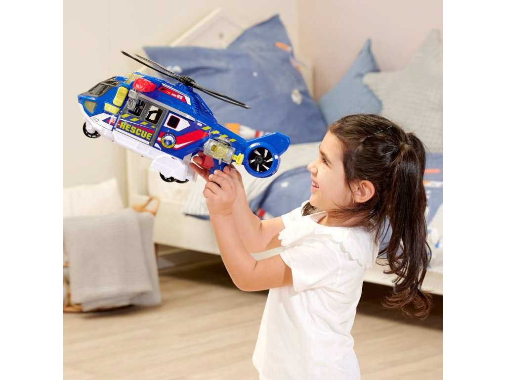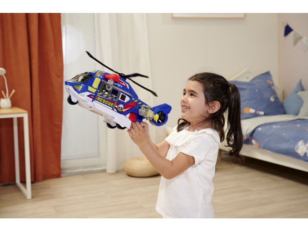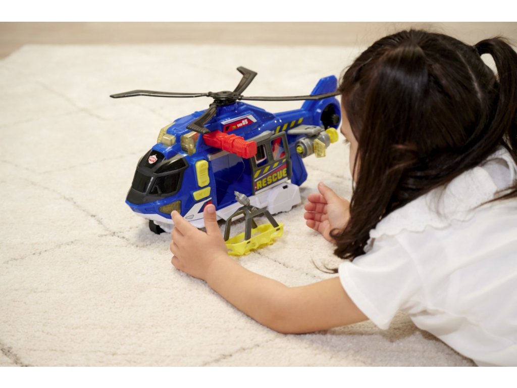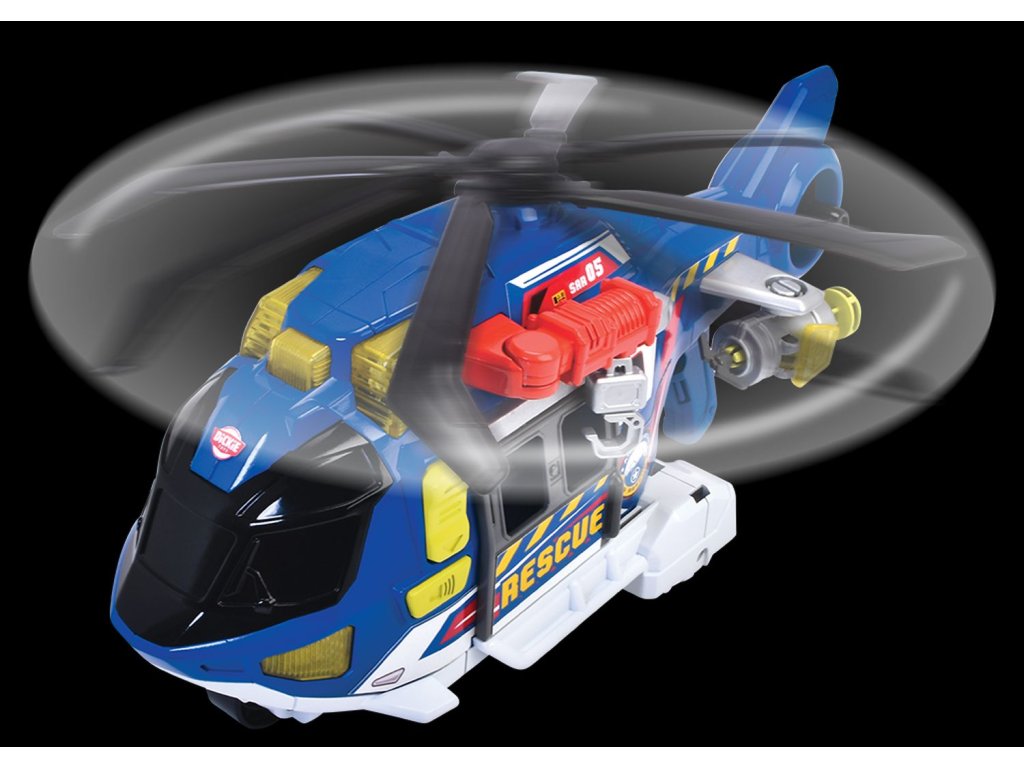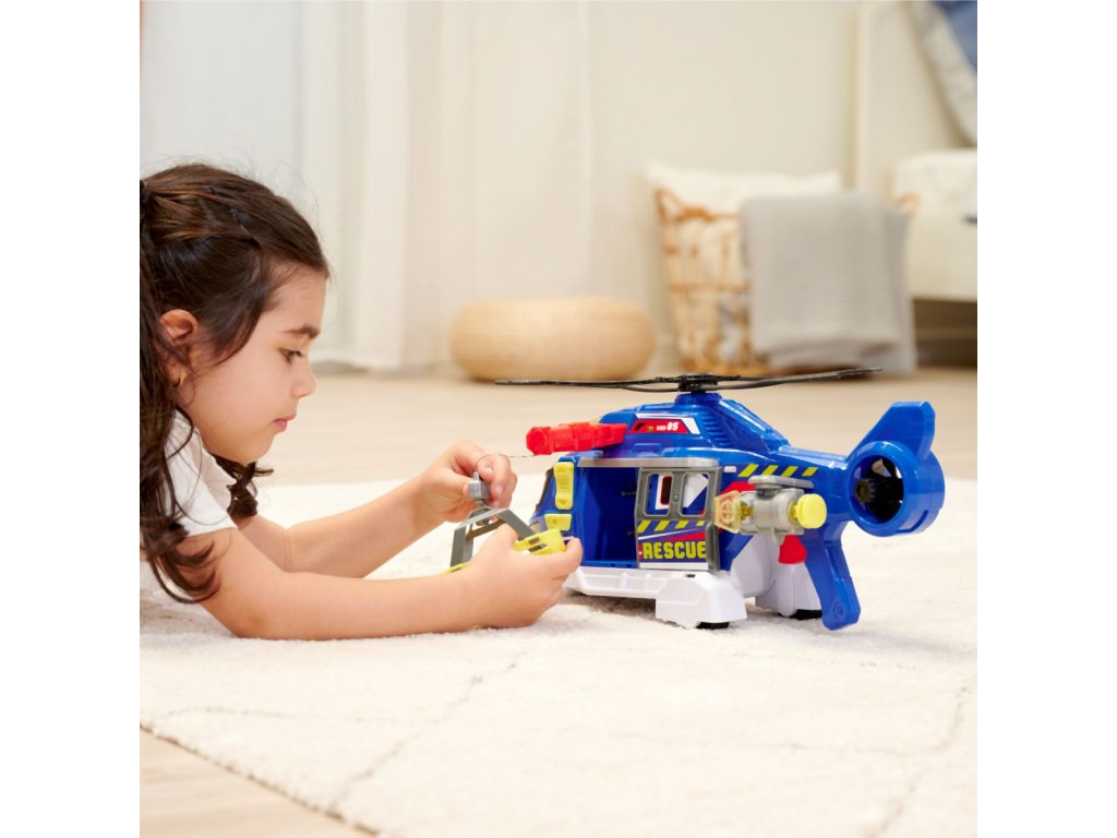 Helikoptéra na volnoběh, světelná a zvuková funkce, mechanický pohyb vrtule, otevírací dveře a pohyblivé části. Součástí je lehátko, které se ovládá tlačítkem (nahoru/dolů). Délka 39 cm.Doplňkové parametry