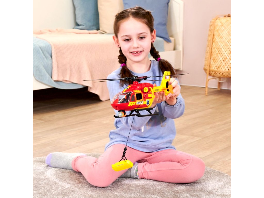 Záchranářská helikoptéra se světelným a zvukovým efektem, pohyblivé a otevírací části, lehátko součástí. Délka 36 cm.Doplňkové parametry