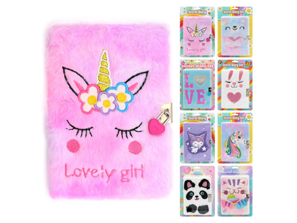 Uzamykatelný zápisník pro děti s hebkou plyšovou obálkou (mix 8 designů).