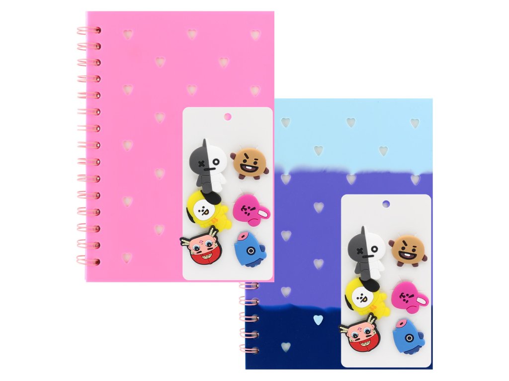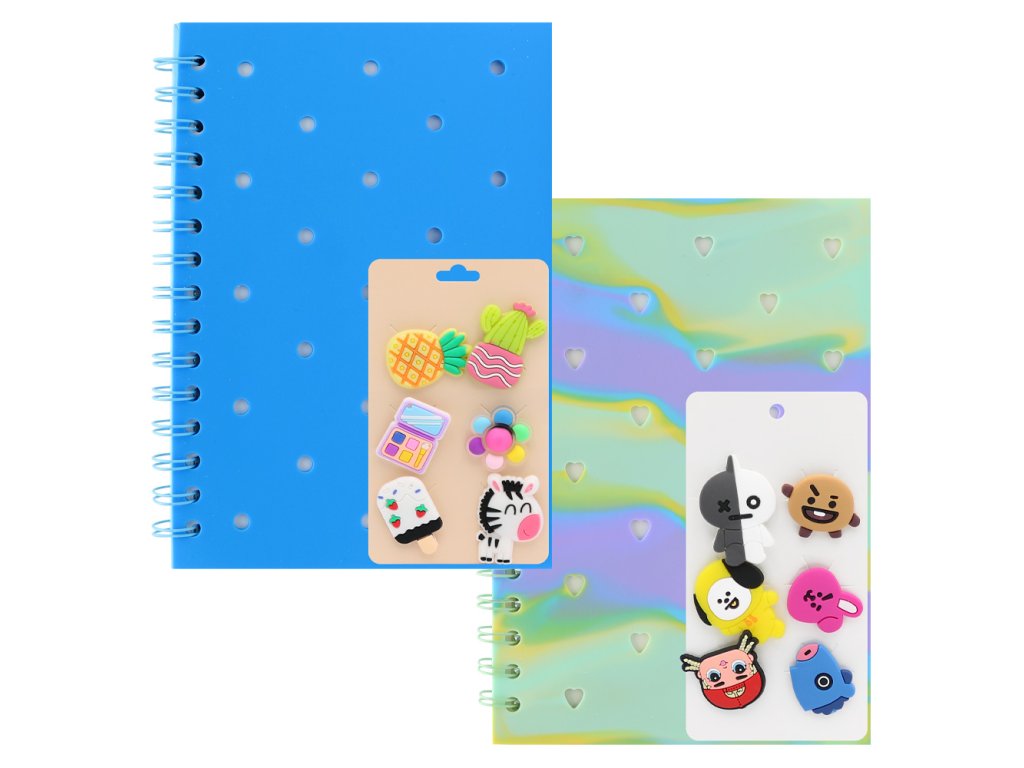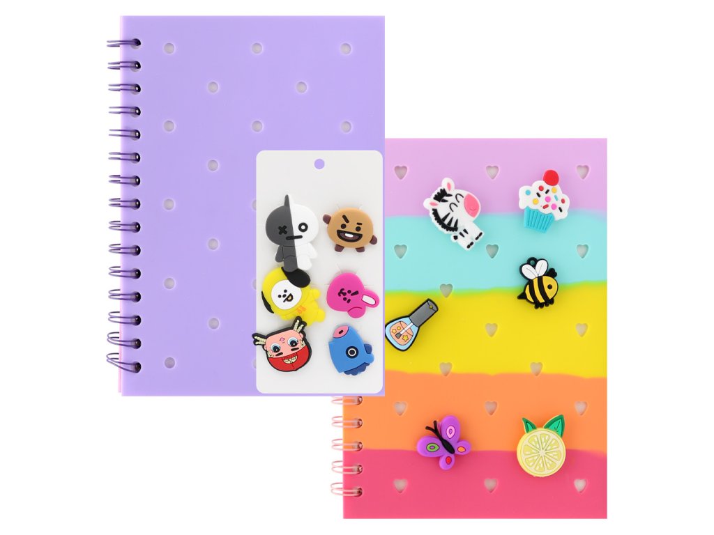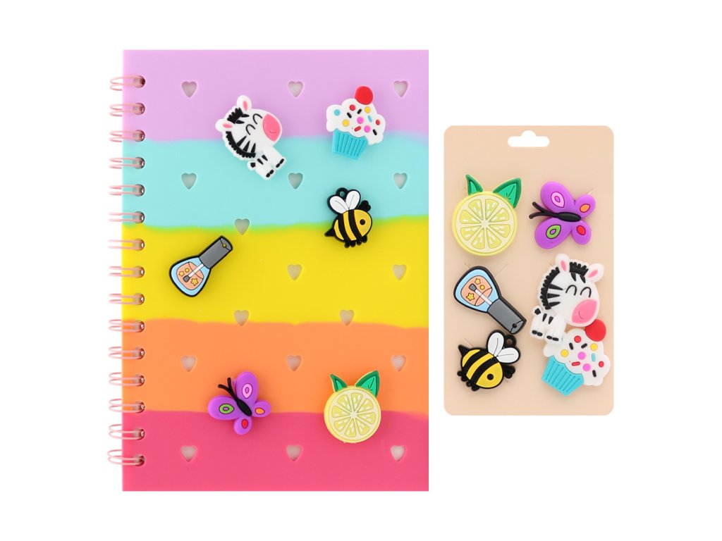 Poznámkový blok se spirálou a přibalenými amuletami pro vlastní ozdobení obálky (mix 6 designů).