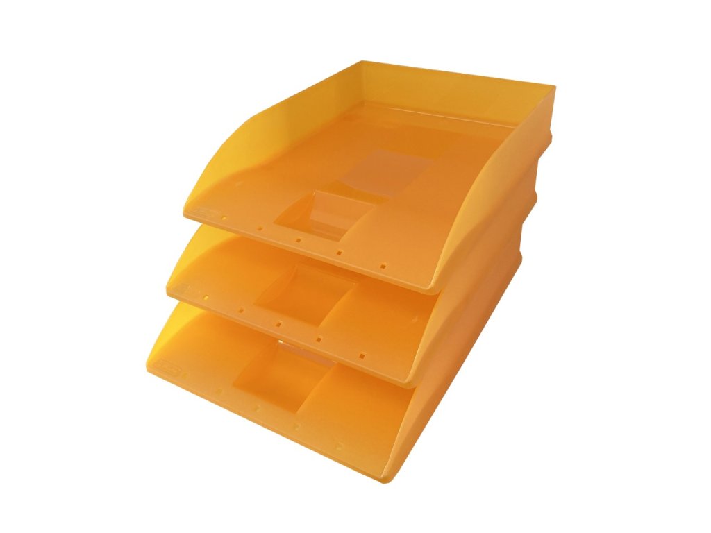 Stohovatelný plastový odkladač dokumentů formátu A4.