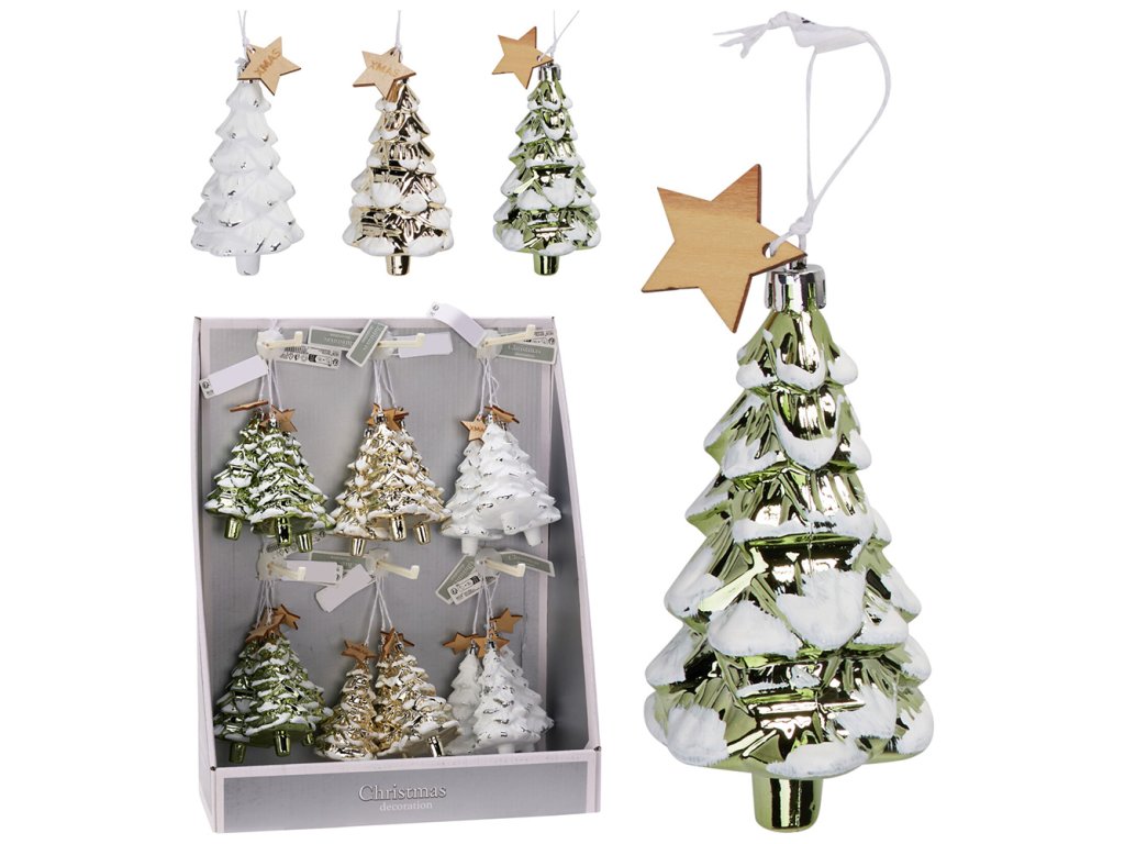 Zasněžený vánoční stromek jako závěsná ozdoba.
